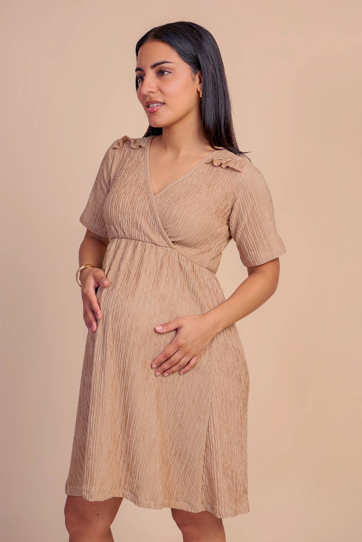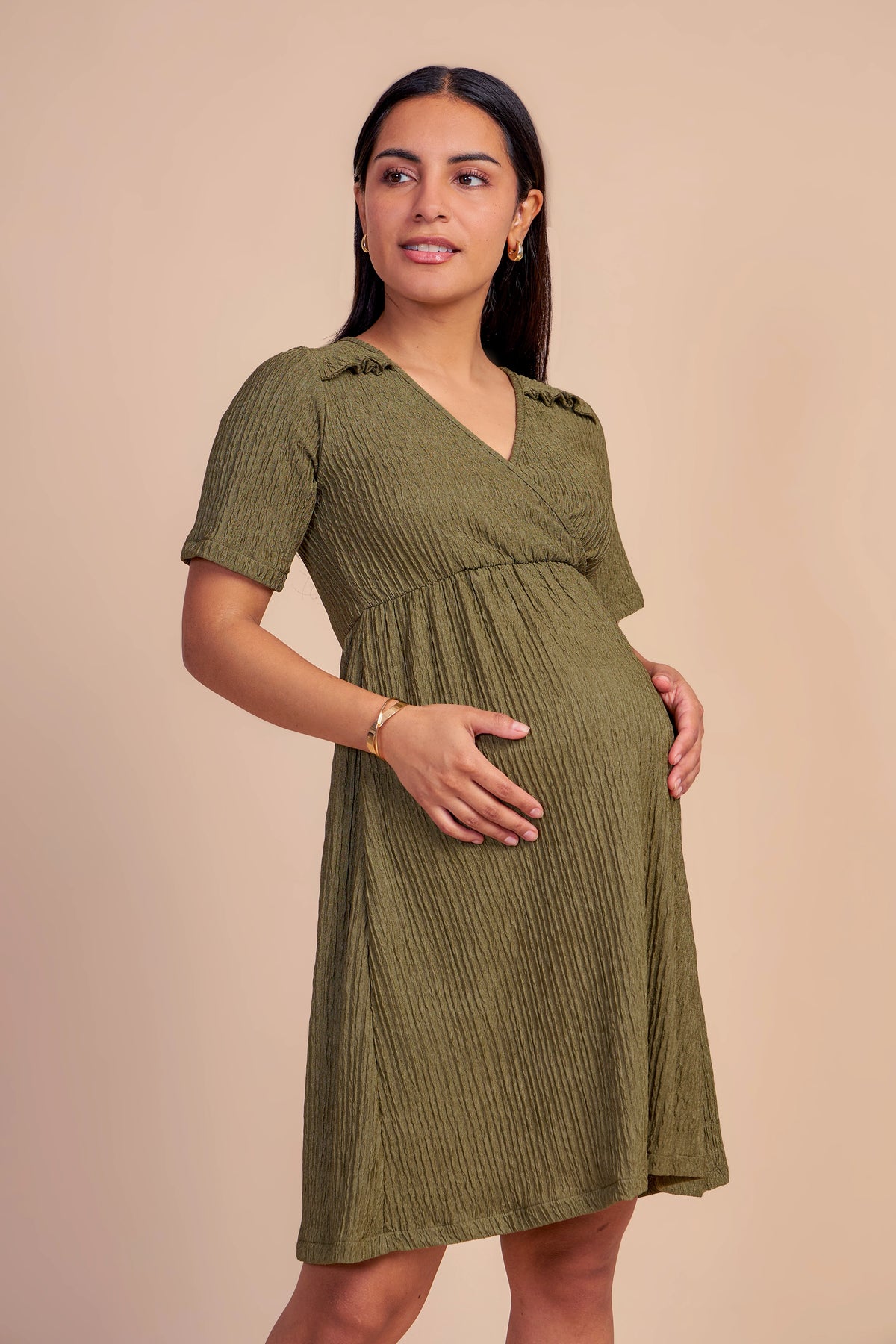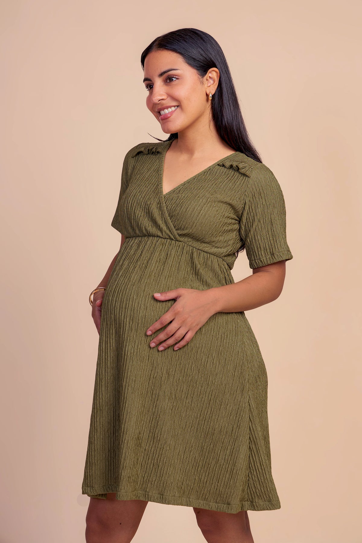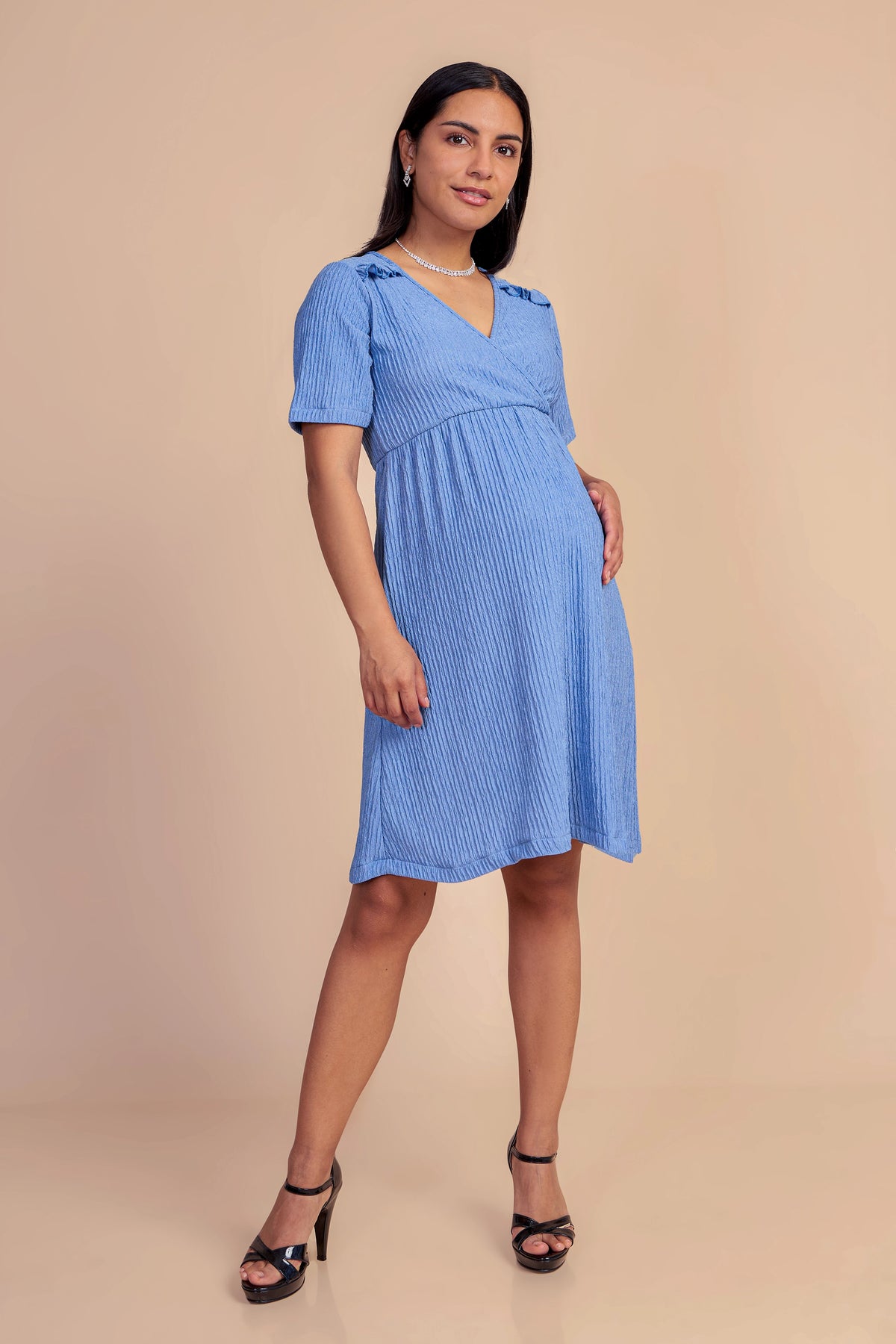 El vestido Alina, combina elegancia y comodidad. Su falda corte A y el detalle bajo el busto realzan la silueta de la futura mamá, mientras que los delicados acabados en la parte superior añaden un toque sofisticado. Ideal para ocasiones especiales o para lucir arreglada sin perder confort.