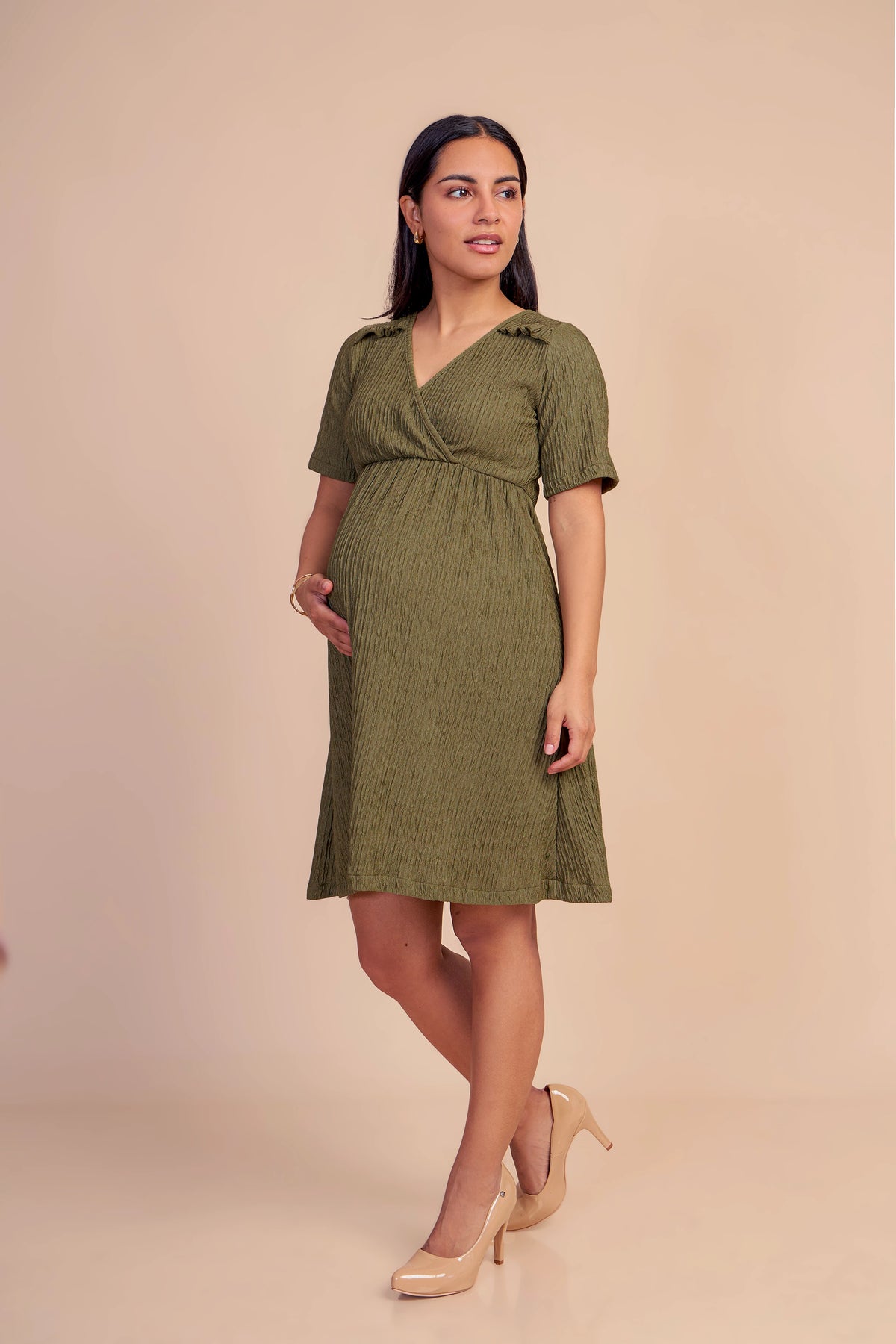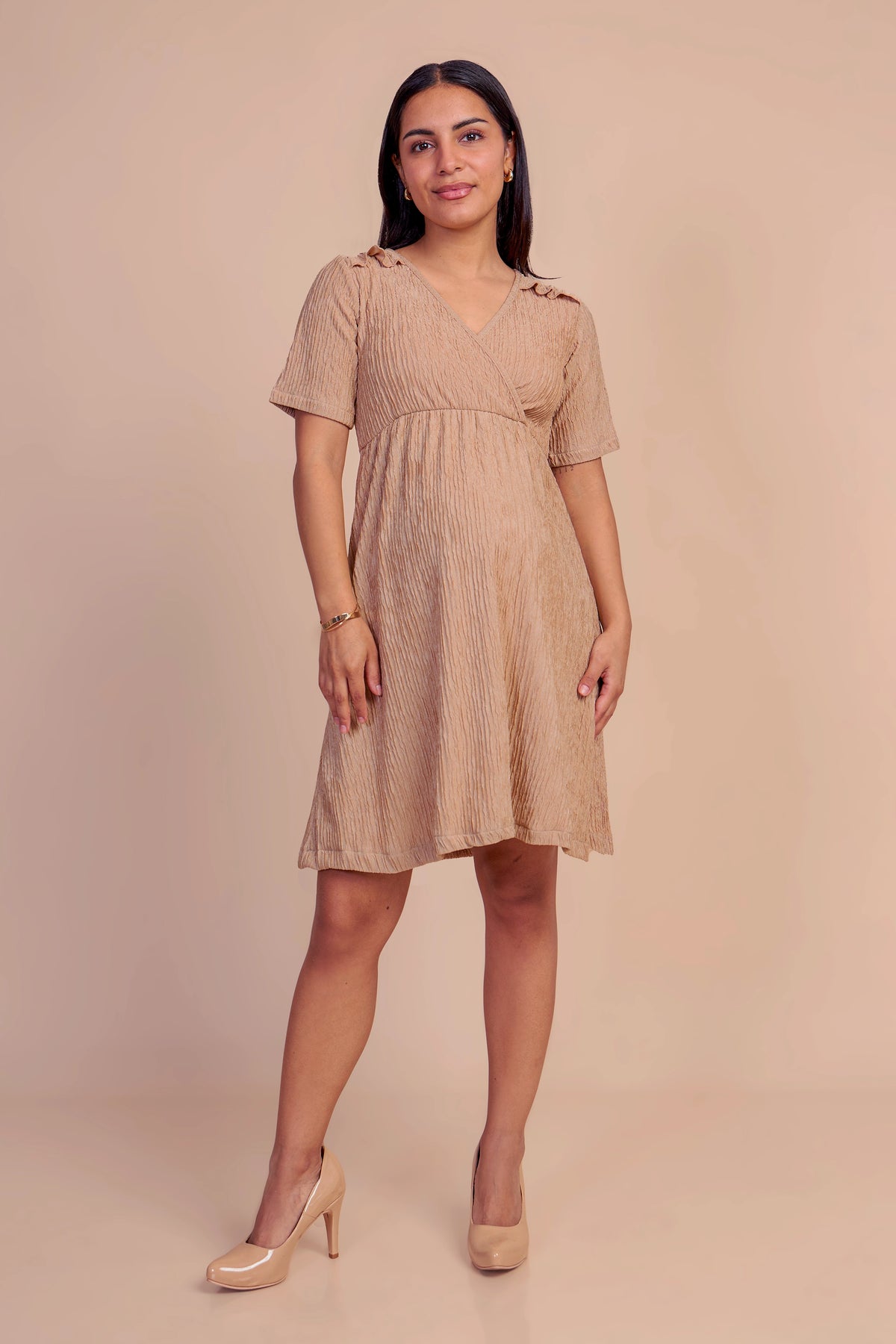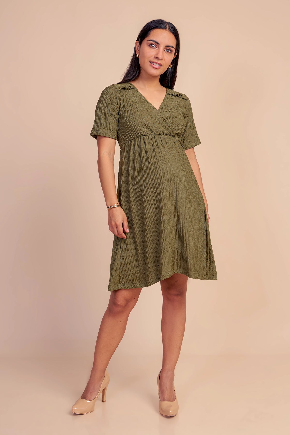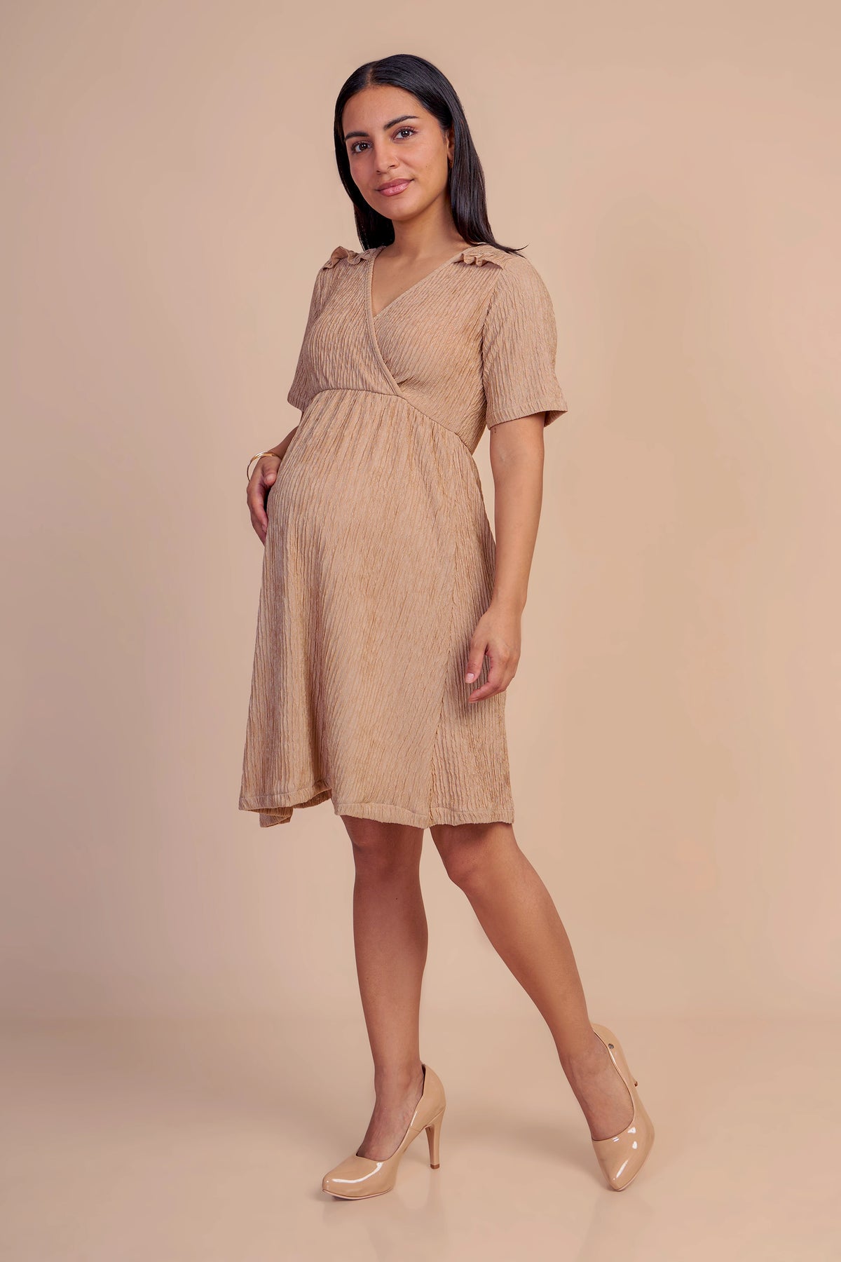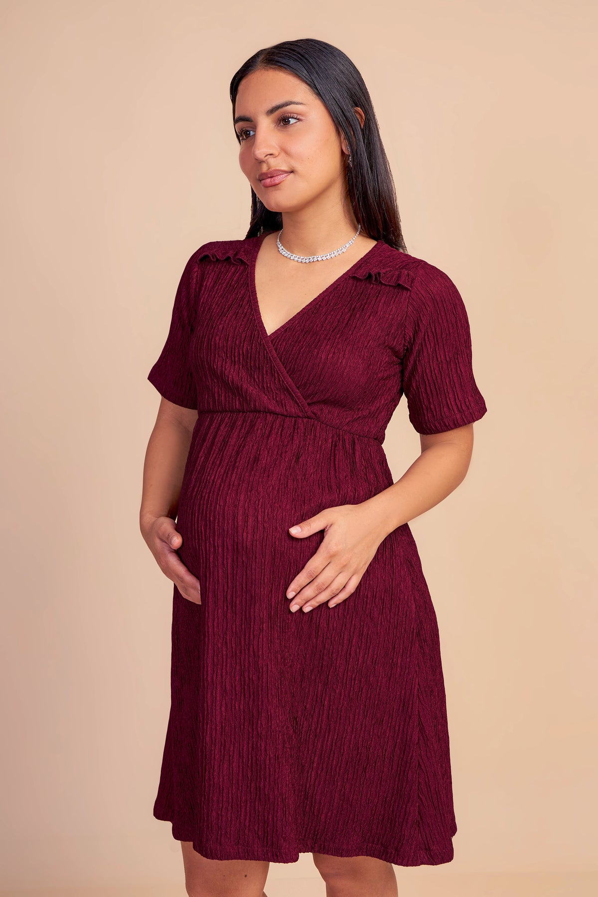 El vestido Alina, combina elegancia y comodidad. Su falda corte A y el detalle bajo el busto realzan la silueta de la futura mamá, mientras que los delicados acabados en la parte superior añaden un toque sofisticado. Ideal para ocasiones especiales o para lucir arreglada sin perder confort.