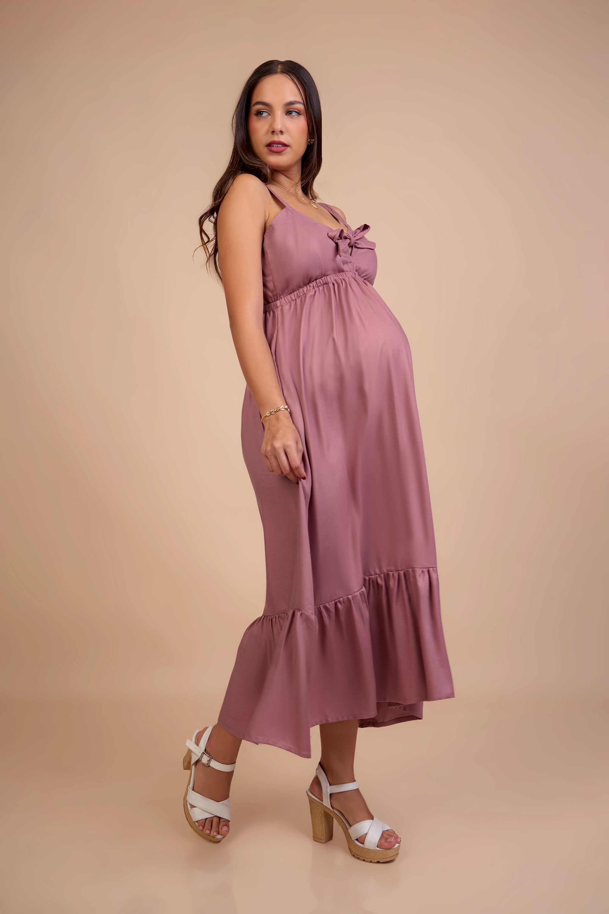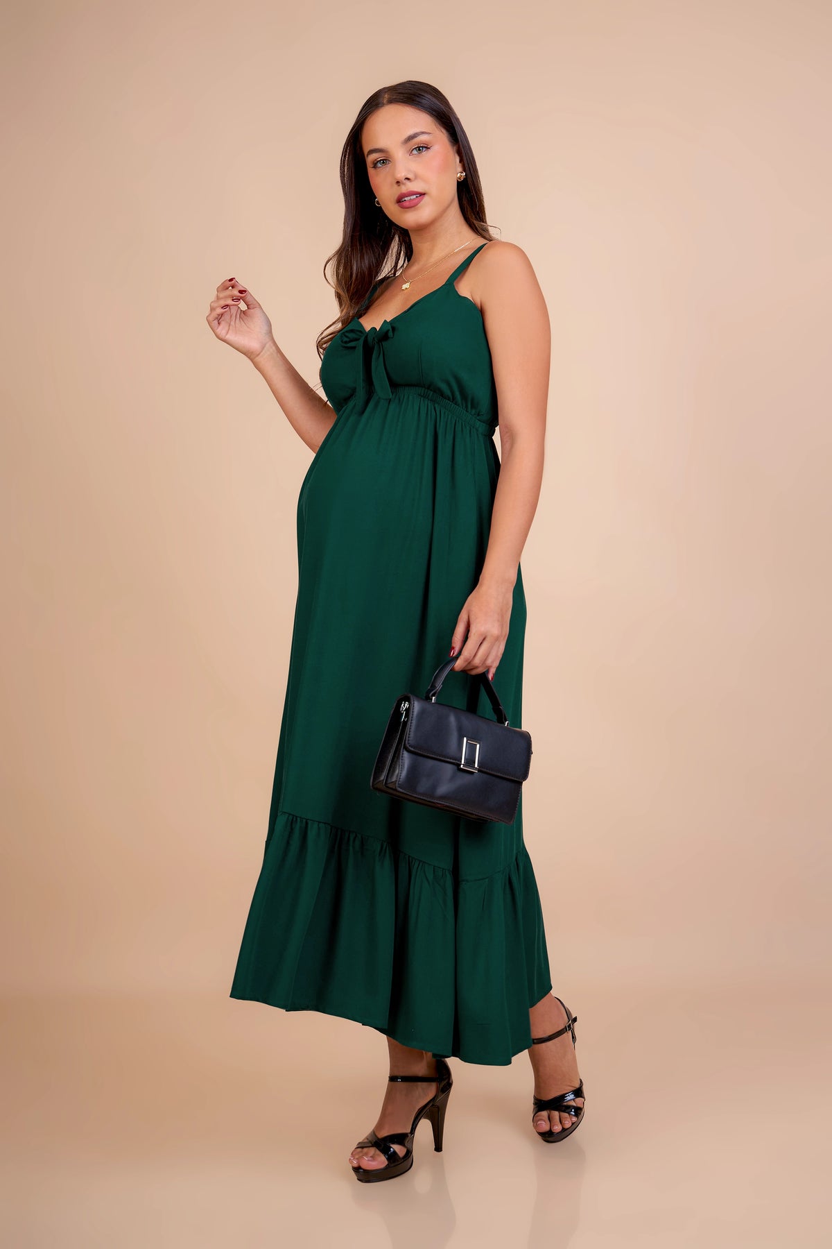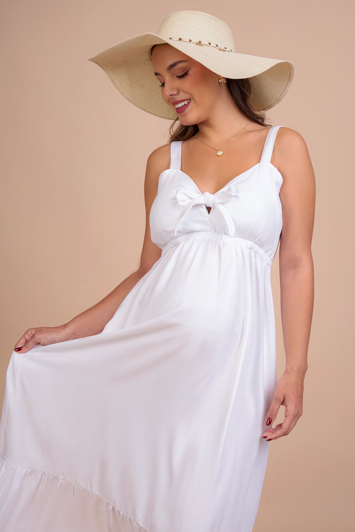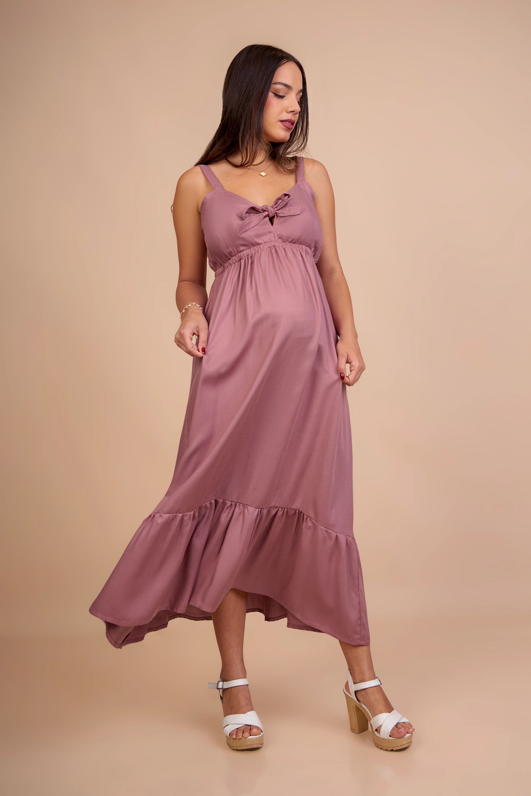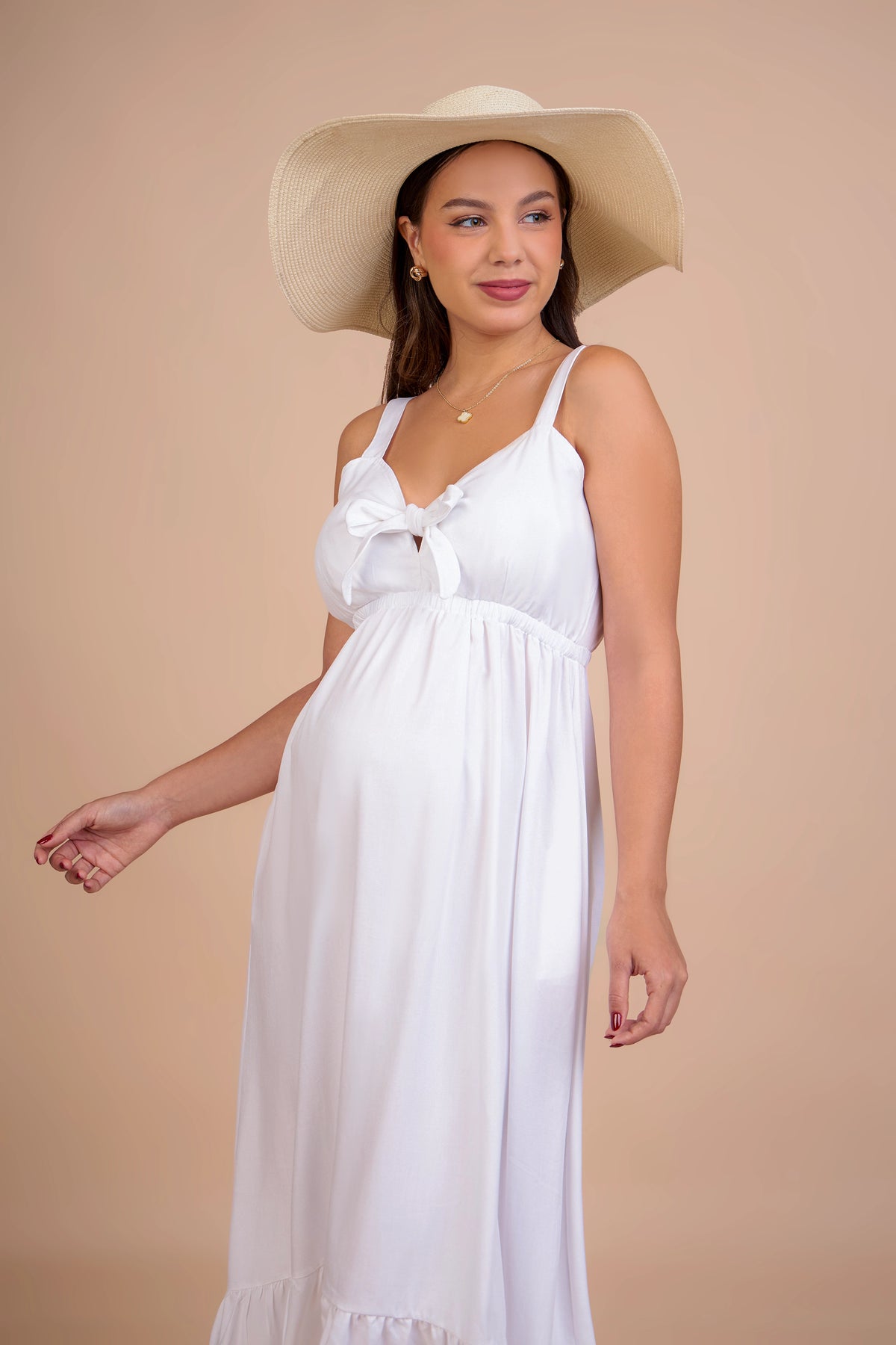 Viste refinada sin perder la frescura, con la elegancia del vestido Antonella. Perfecto para ocasiones especiales. Te hará sentir natural y romántica gracias a su falda larga y ligera. La parte del busto lleva unas lindas copas. Se regula con un lindo nudo en el pecho, perfecto para una lactancia fácil y sofisticada.
