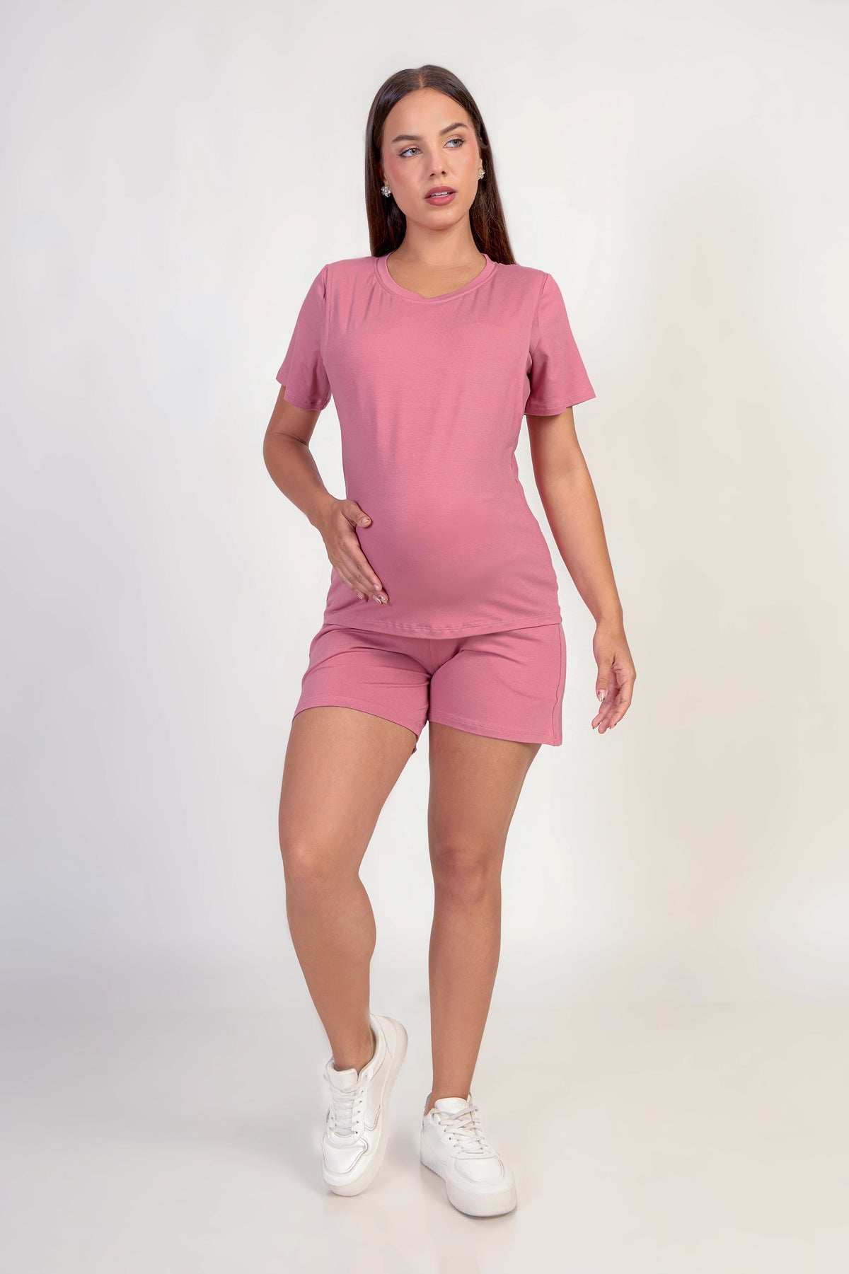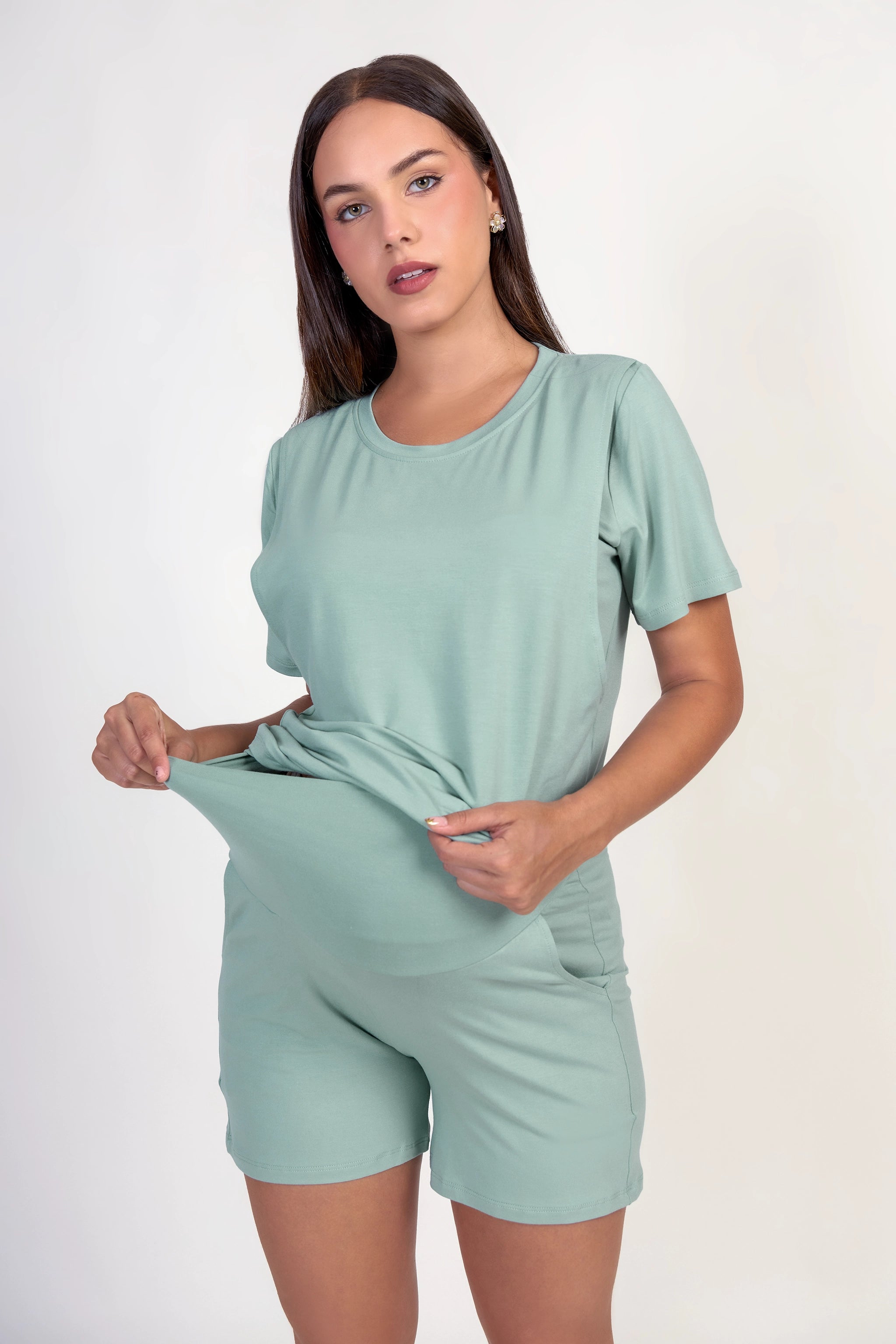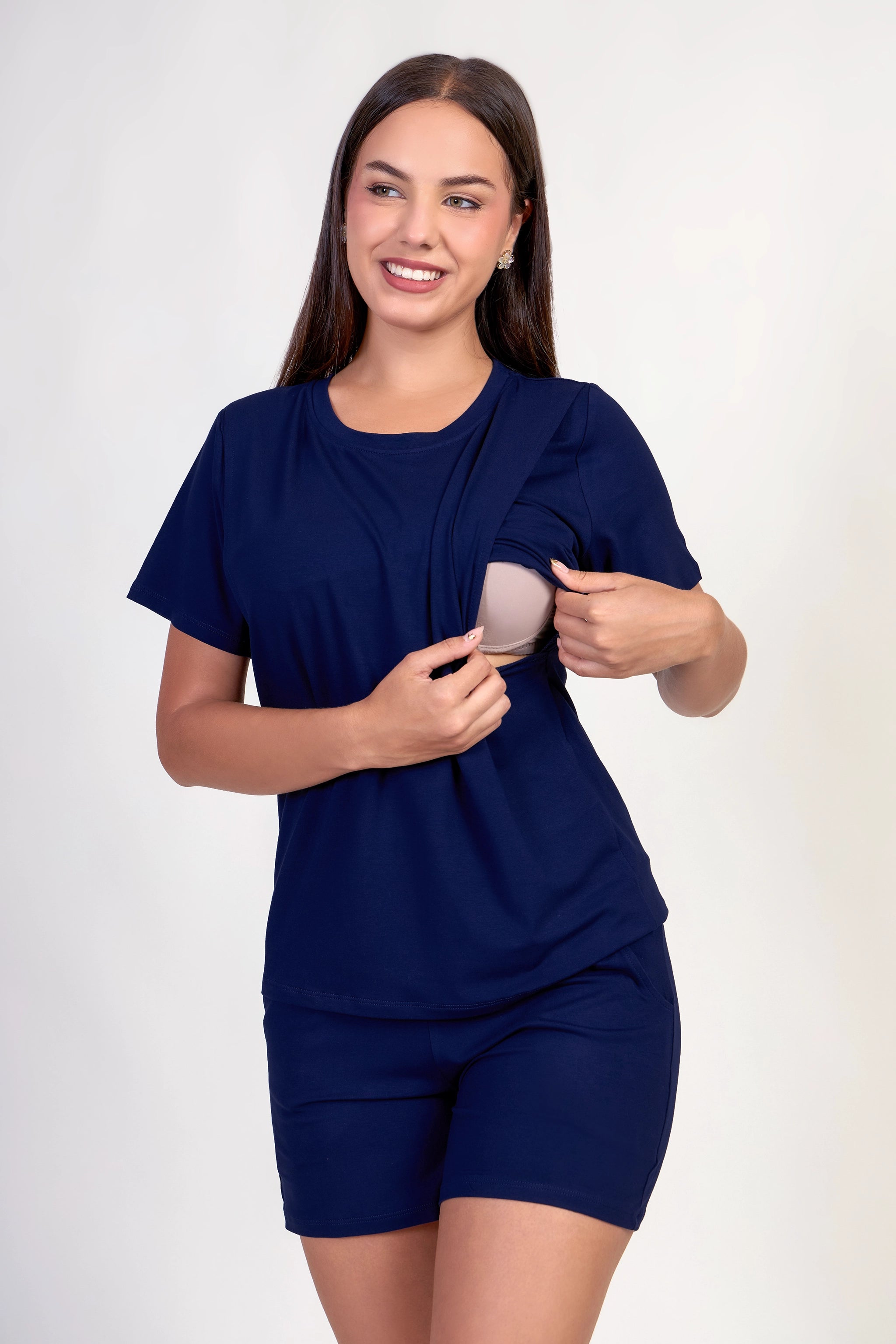 Conjunto de maternidad y lactancia Yamilet hecho en una tela suave, fresca y elástica que se adapta cómodamente al crecimiento de la pancita. El polo cuenta con acceso práctico a la lactancia, ideal para esta etapa, y el short tiene un calce cómodo que acompaña sin apretar. Perfecto para el día a día, para estar en casa o salir con total comodidad y estilo.