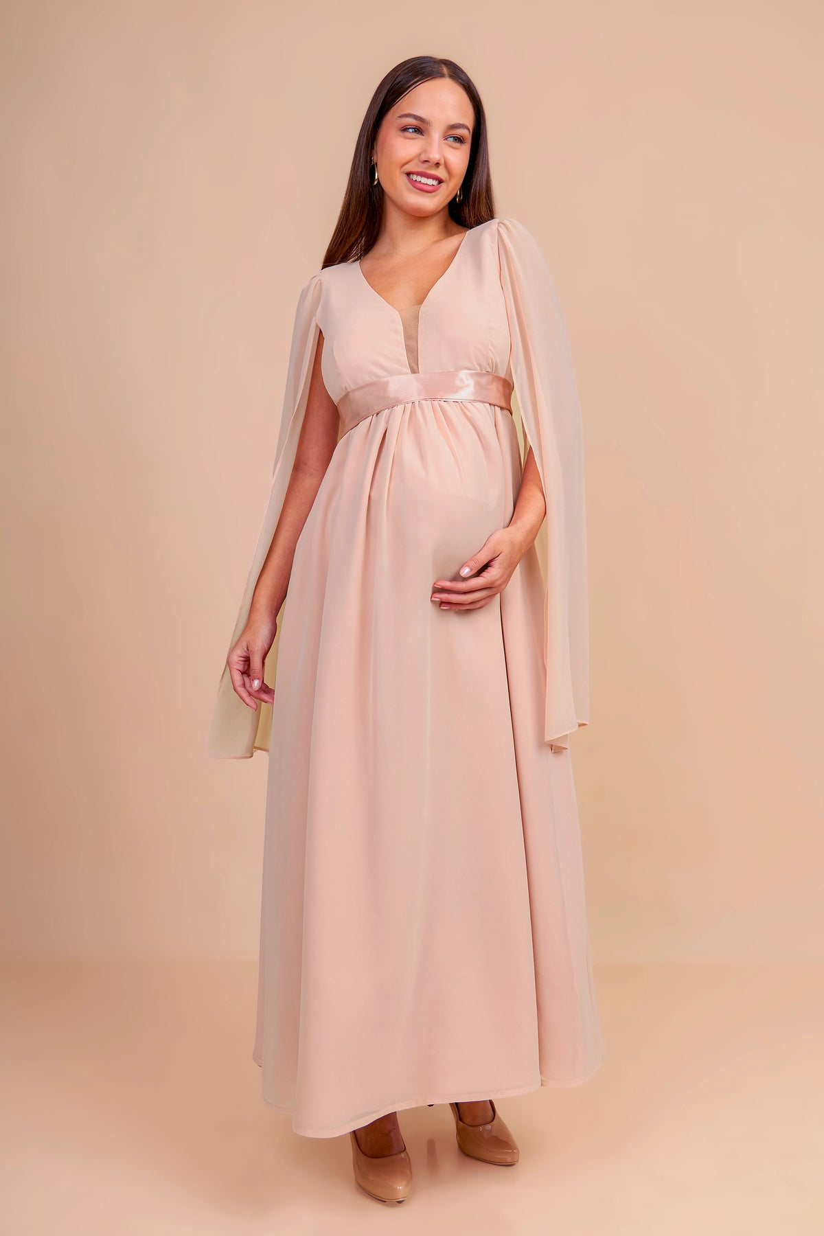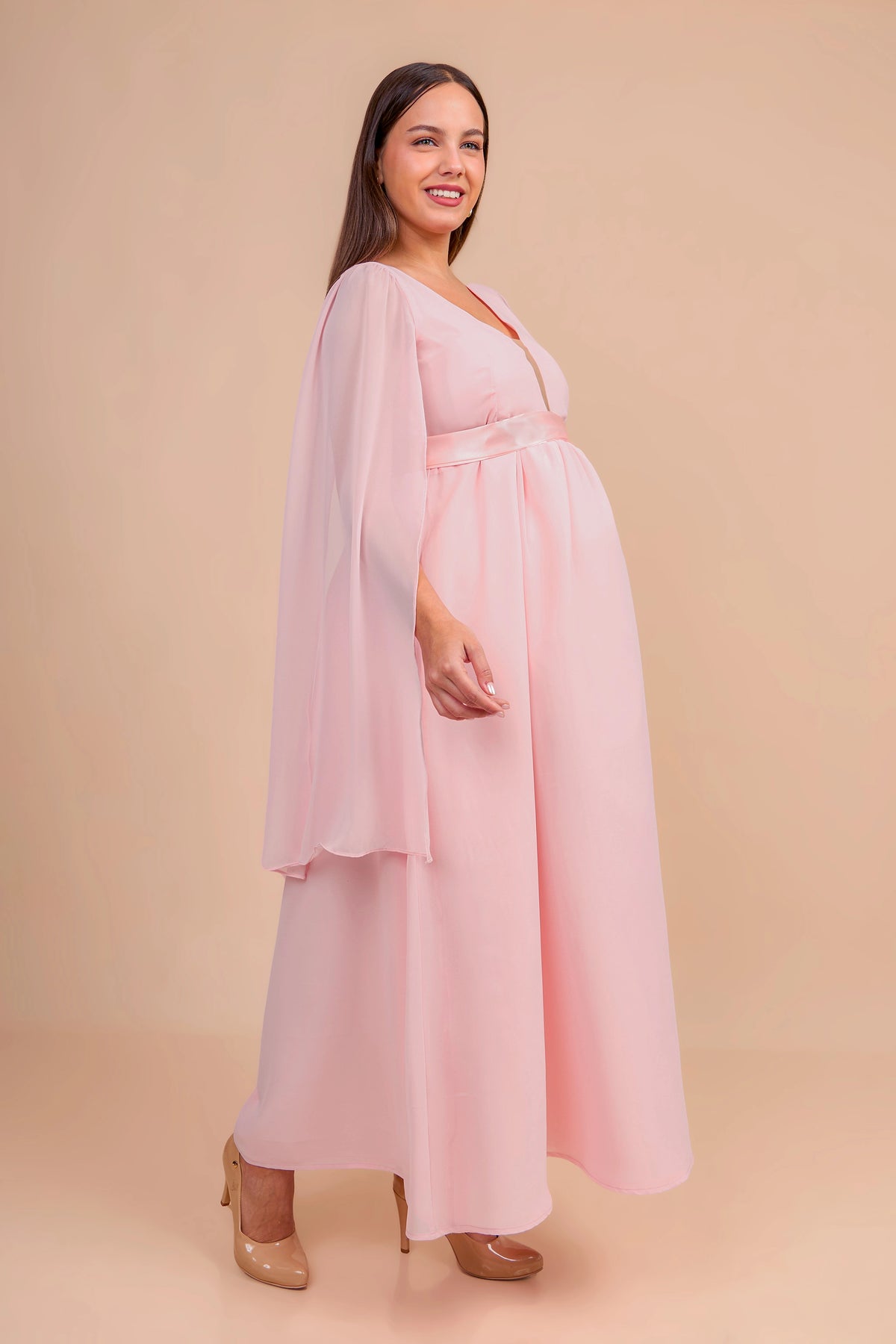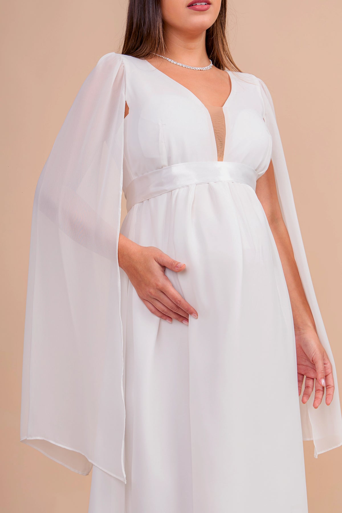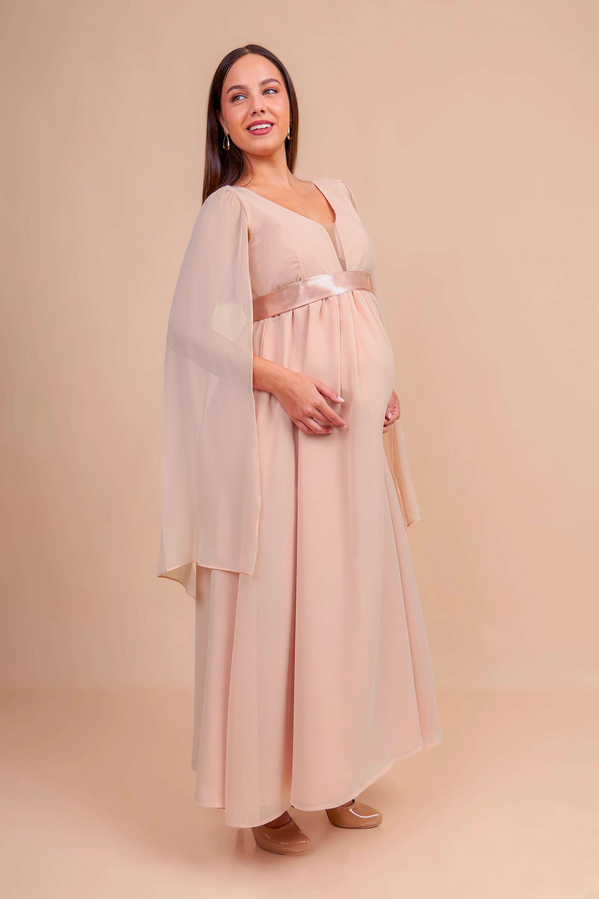 El Vestido Irene destaca por su elegancia y fluidez. Confeccionado en gasa y raso, combina suavidad y movimiento en una silueta que realza la figura de la futura mamá. Su escote en “V” con detalle de tul aporta un toque moderno, mientras las mangas tipo capa le dan un aire romántico y sofisticado. Ideal para sesiones de fotos, baby showers o eventos especiales.