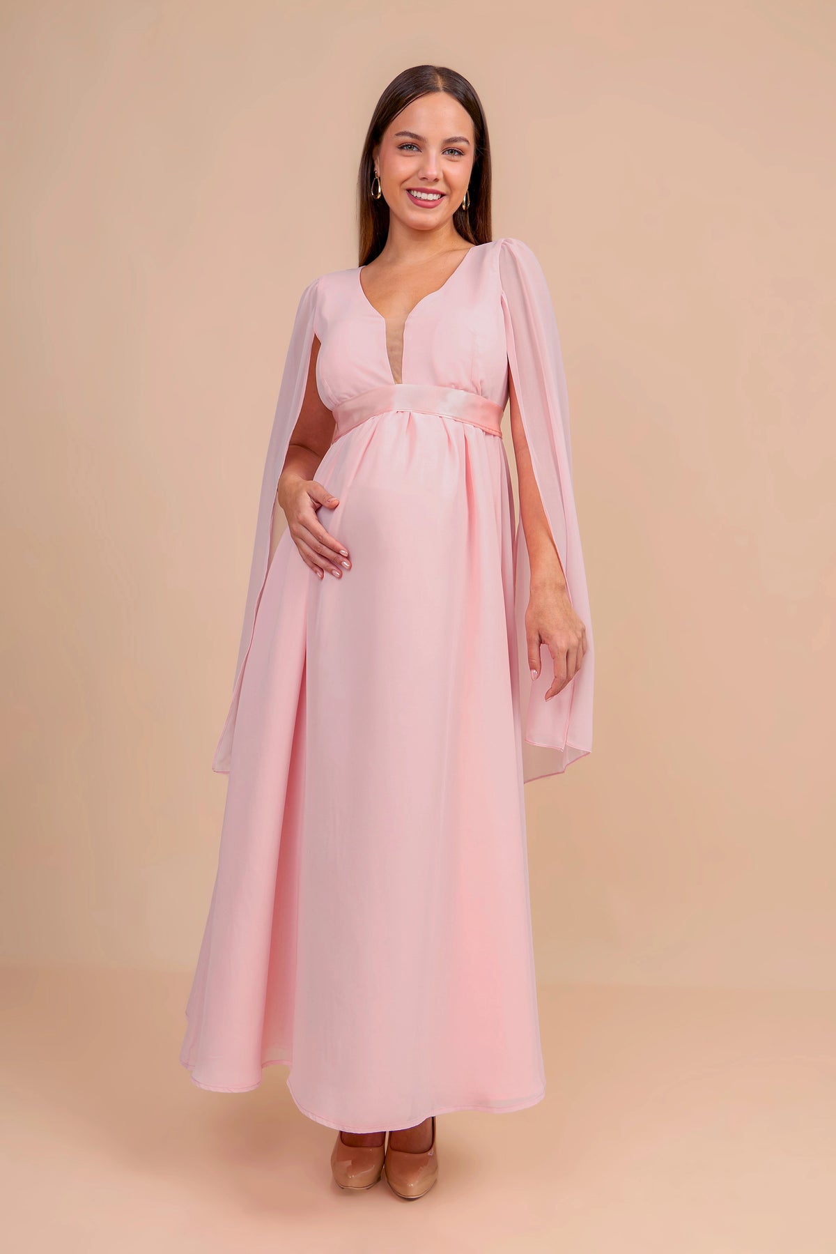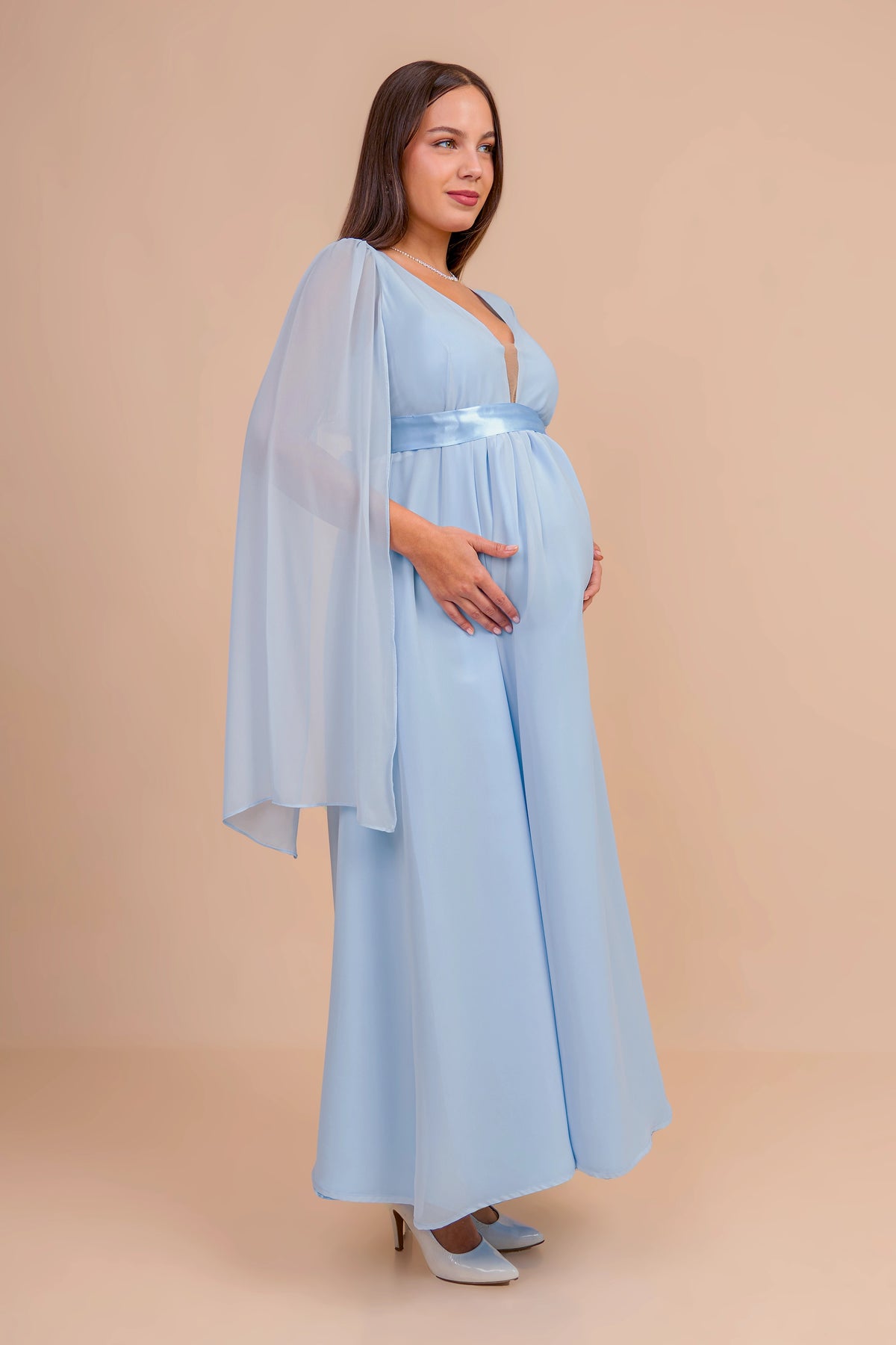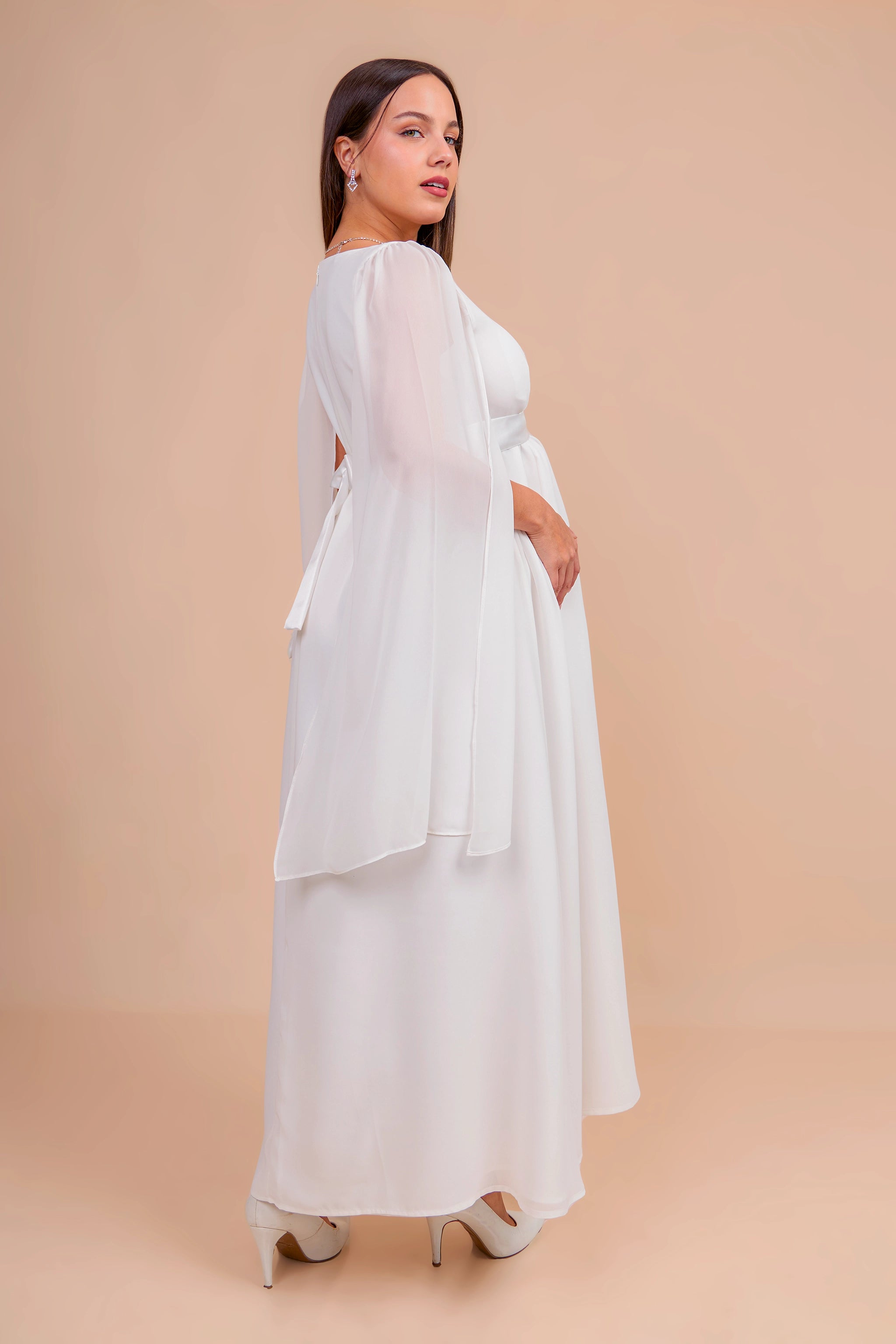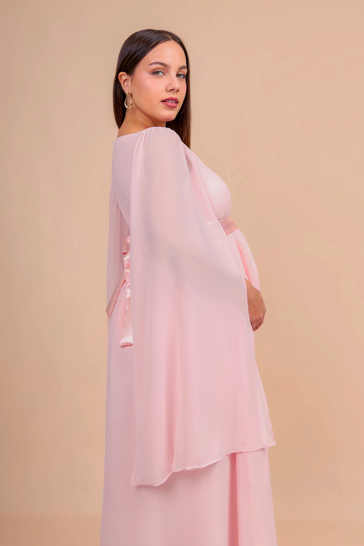 El Vestido Irene destaca por su elegancia y fluidez. Confeccionado en gasa y raso, combina suavidad y movimiento en una silueta que realza la figura de la futura mamá. Su escote en “V” con detalle de tul aporta un toque moderno, mientras las mangas tipo capa le dan un aire romántico y sofisticado. Ideal para sesiones de fotos, baby showers o eventos especiales.