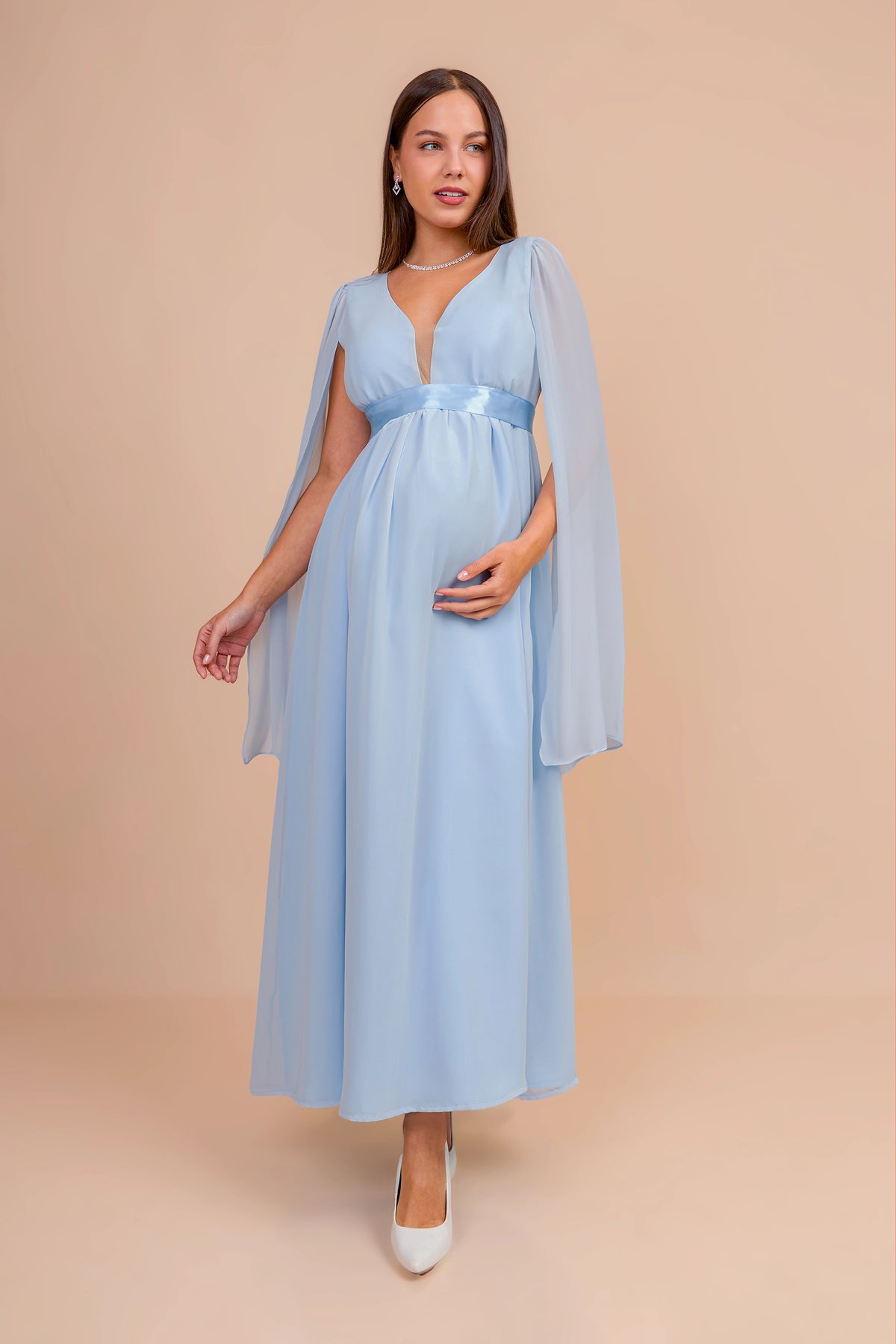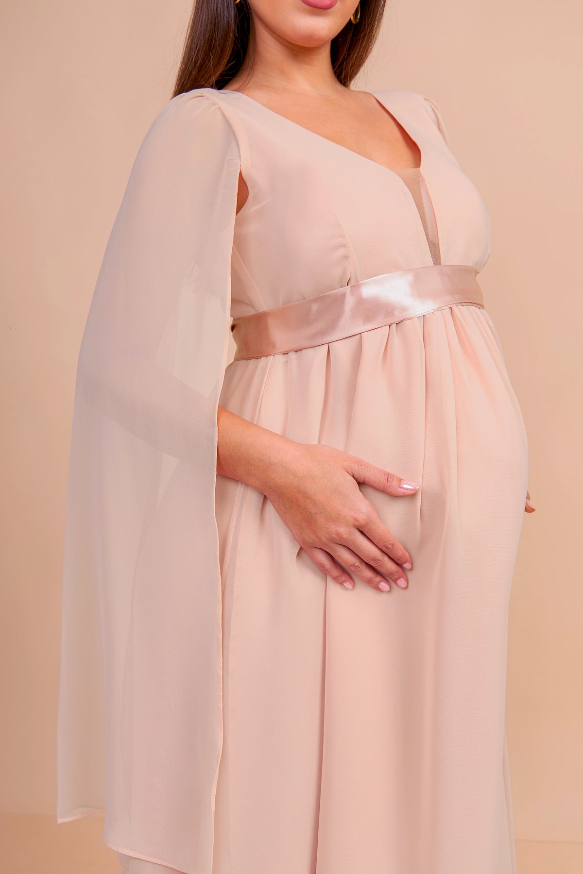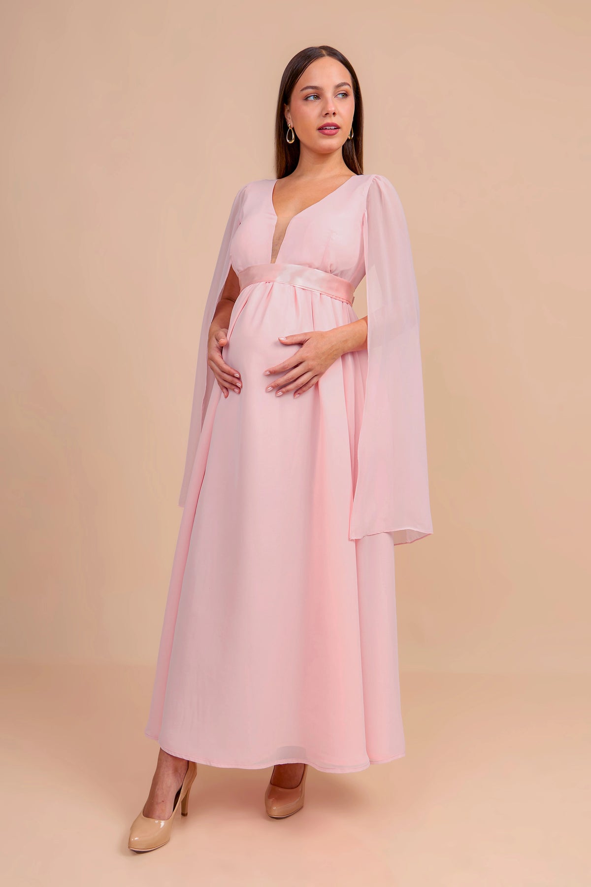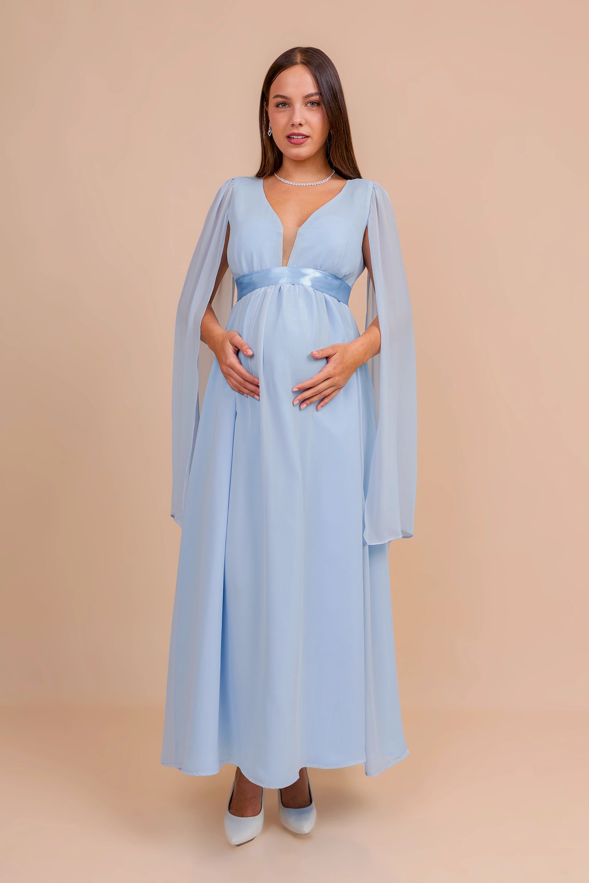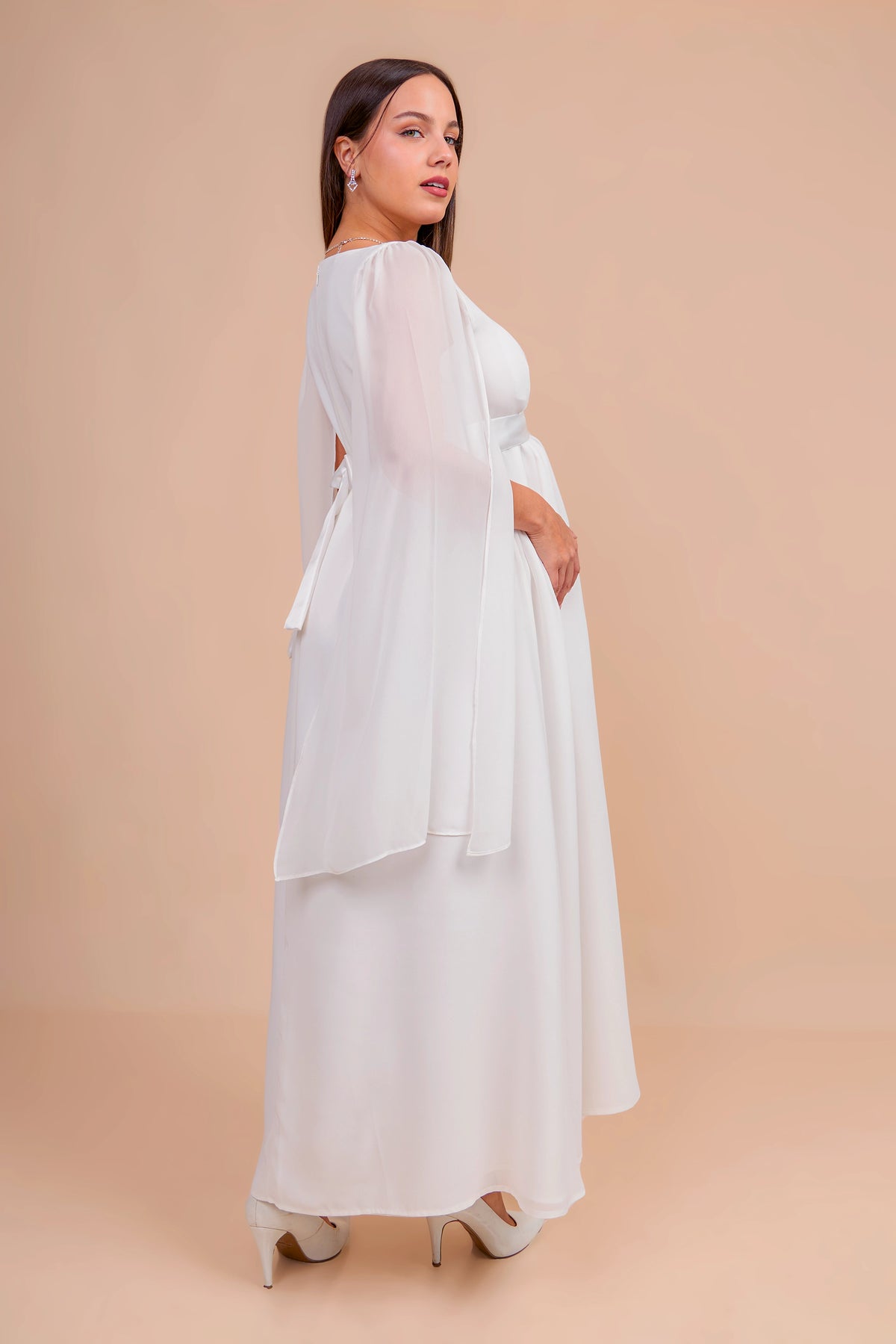 El Vestido Irene destaca por su elegancia y fluidez. Confeccionado en gasa y raso, combina suavidad y movimiento en una silueta que realza la figura de la futura mamá. Su escote en “V” con detalle de tul aporta un toque moderno, mientras las mangas tipo capa le dan un aire romántico y sofisticado. Ideal para sesiones de fotos, baby showers o eventos especiales.