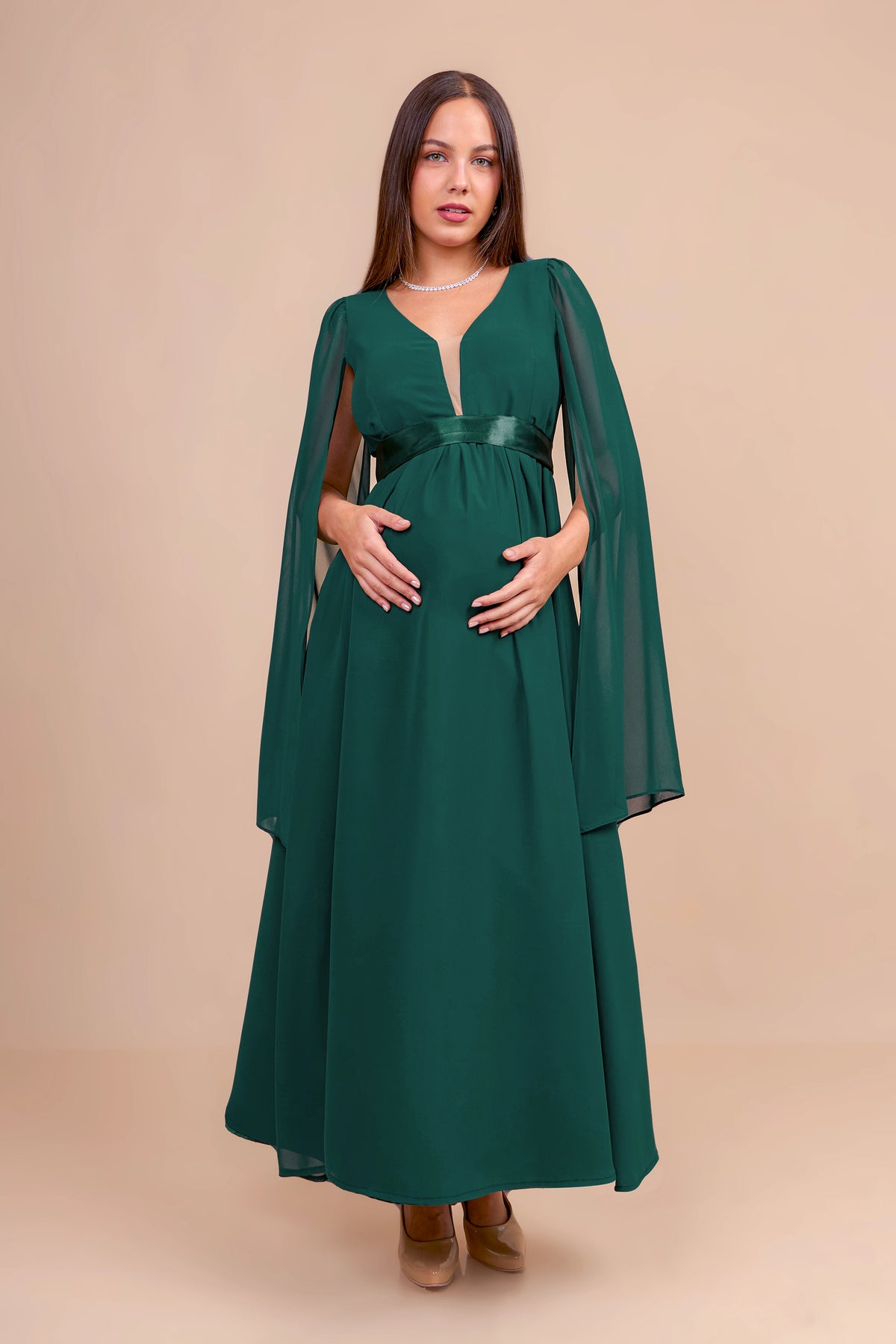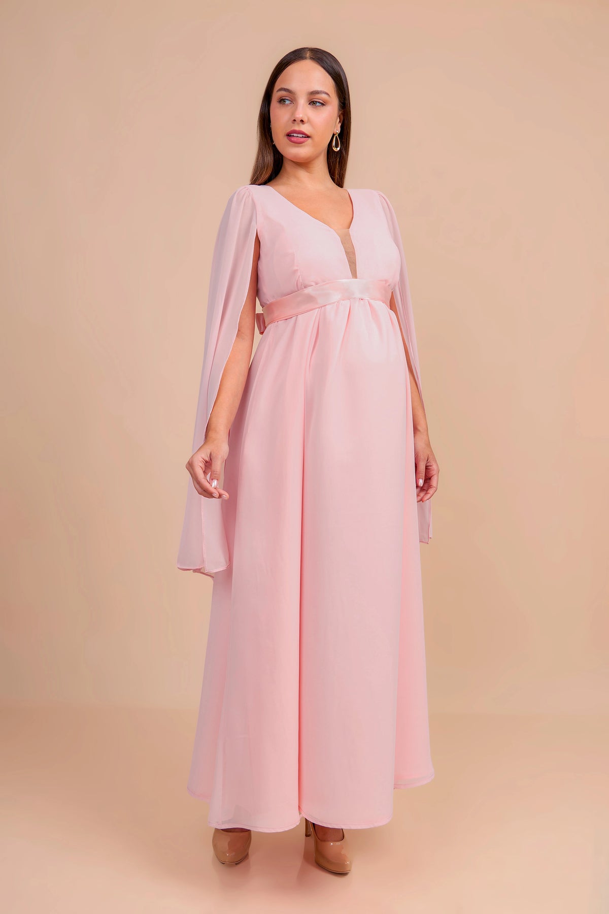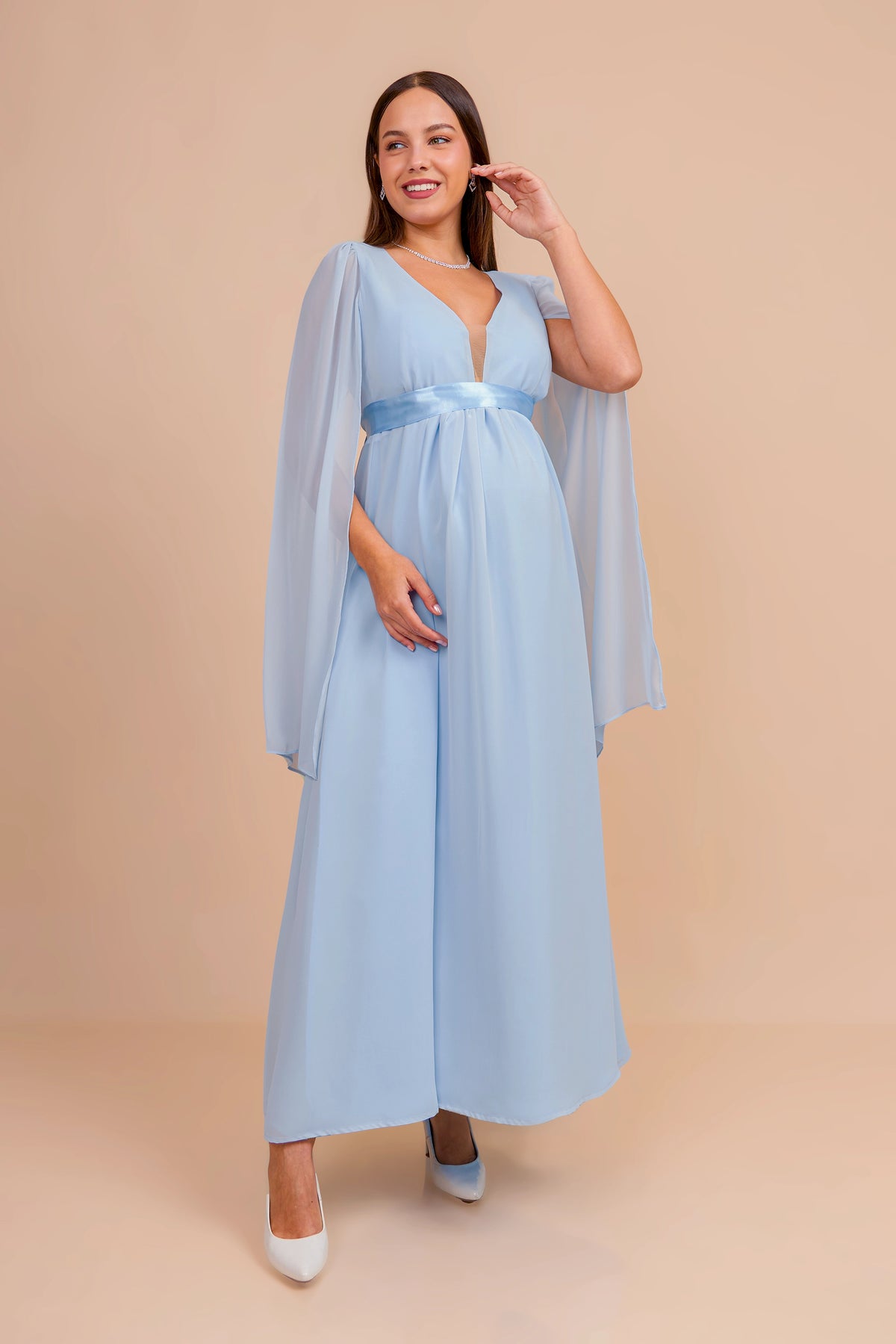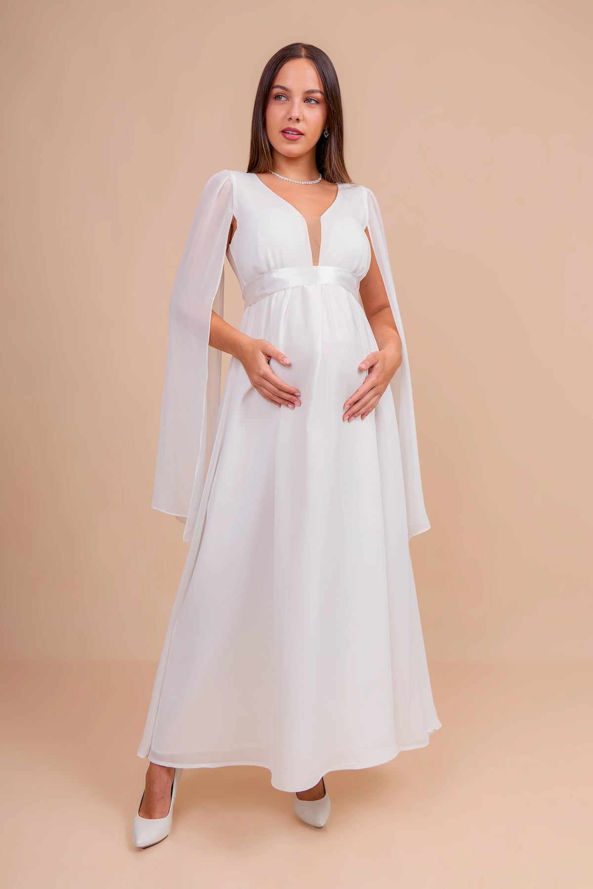 El Vestido Irene destaca por su elegancia y fluidez. Confeccionado en gasa y raso, combina suavidad y movimiento en una silueta que realza la figura de la futura mamá. Su escote en “V” con detalle de tul aporta un toque moderno, mientras las mangas tipo capa le dan un aire romántico y sofisticado. Ideal para sesiones de fotos, baby showers o eventos especiales.
