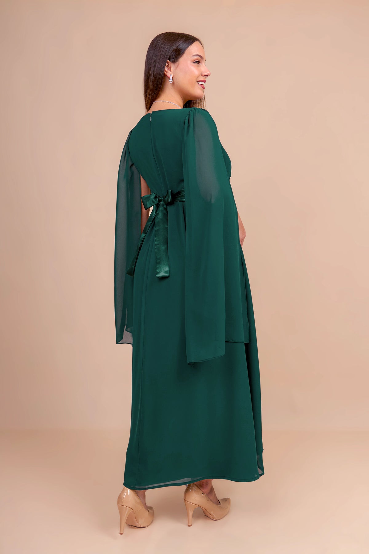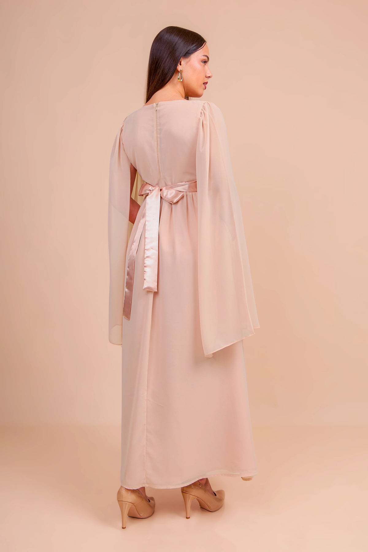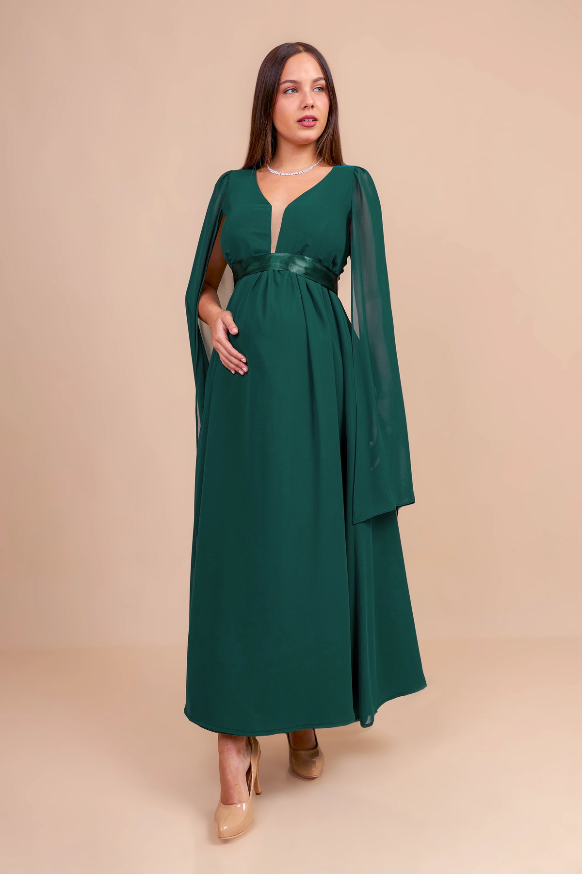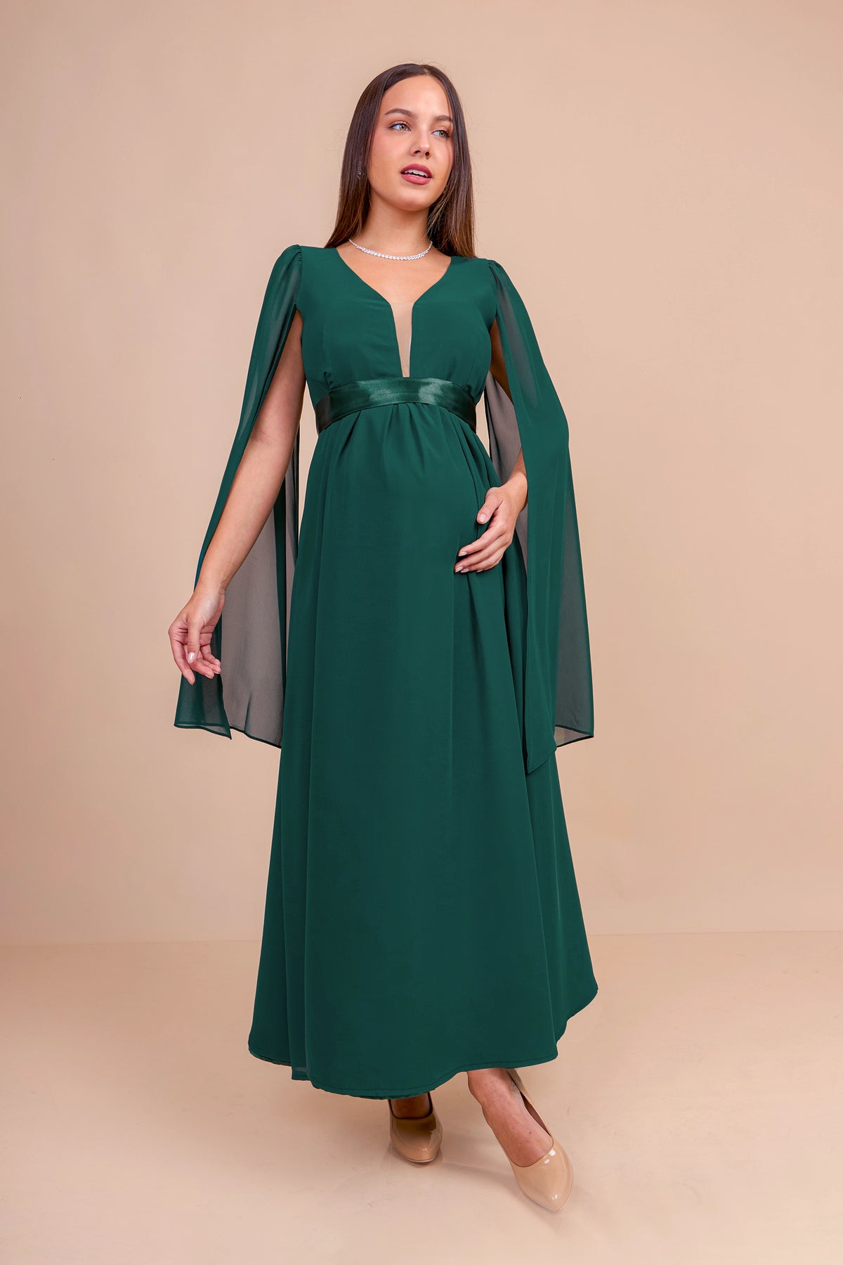 El Vestido Irene destaca por su elegancia y fluidez. Confeccionado en gasa y raso, combina suavidad y movimiento en una silueta que realza la figura de la futura mamá. Su escote en “V” con detalle de tul aporta un toque moderno, mientras las mangas tipo capa le dan un aire romántico y sofisticado. Ideal para sesiones de fotos, baby showers o eventos especiales.