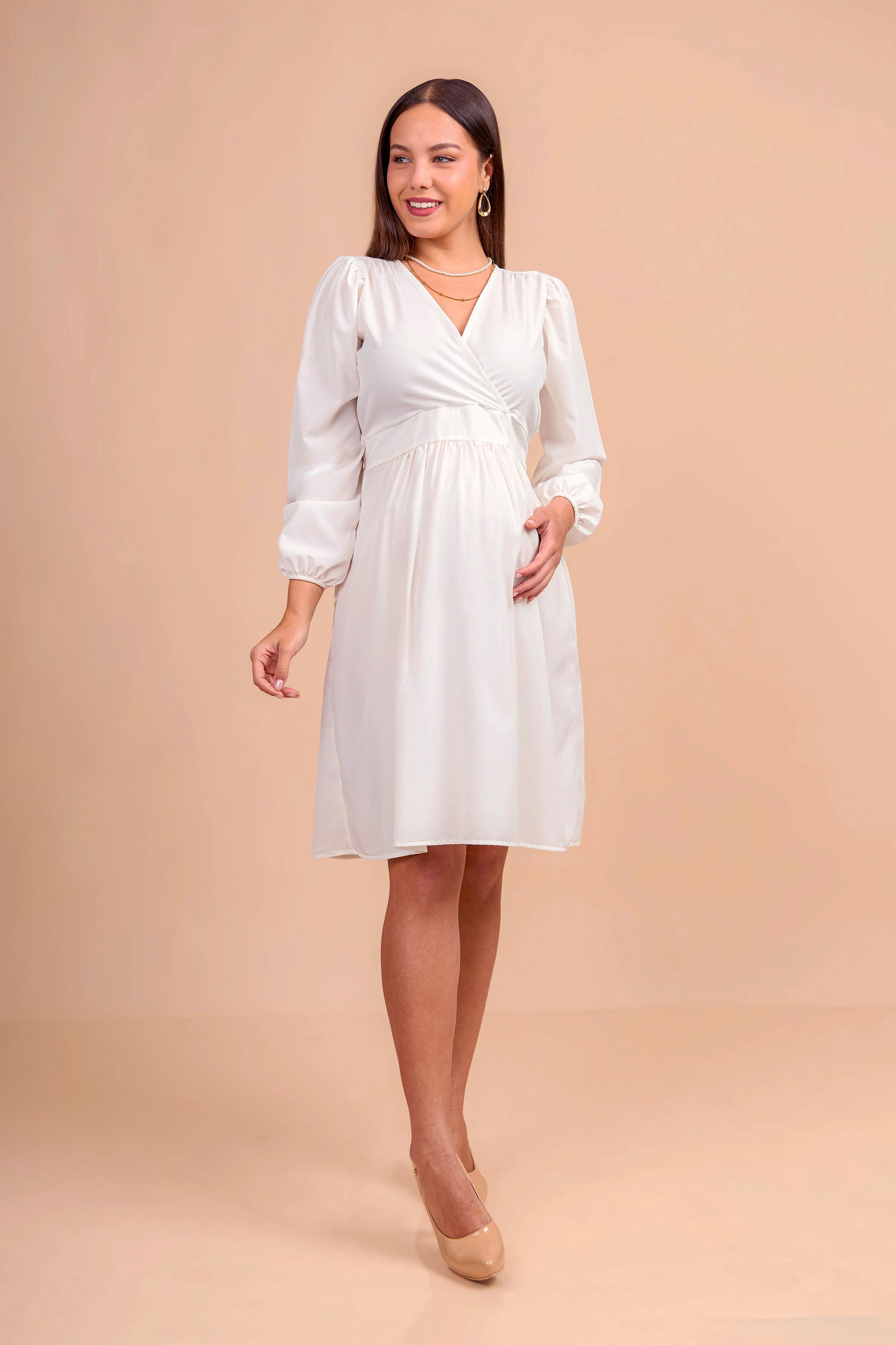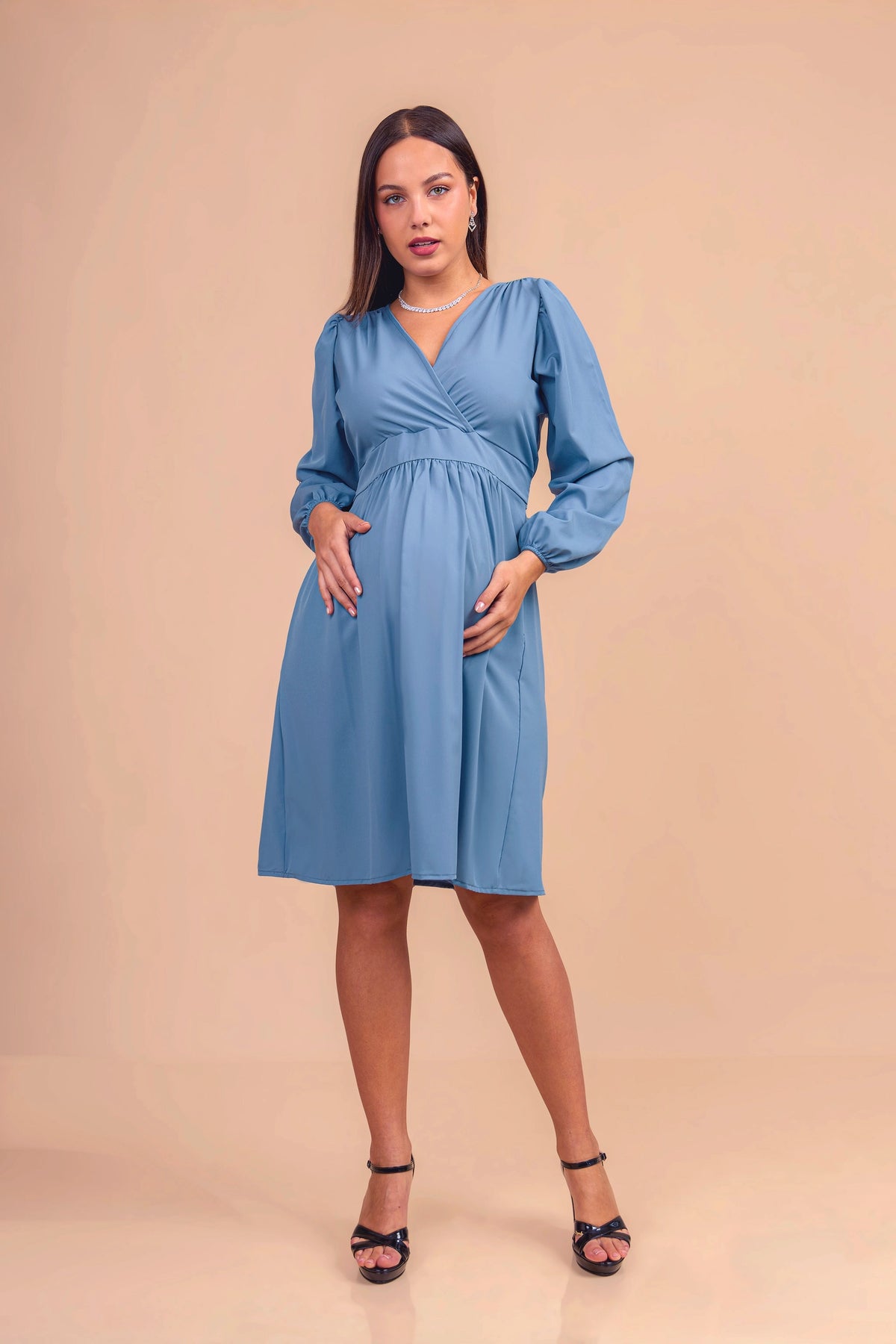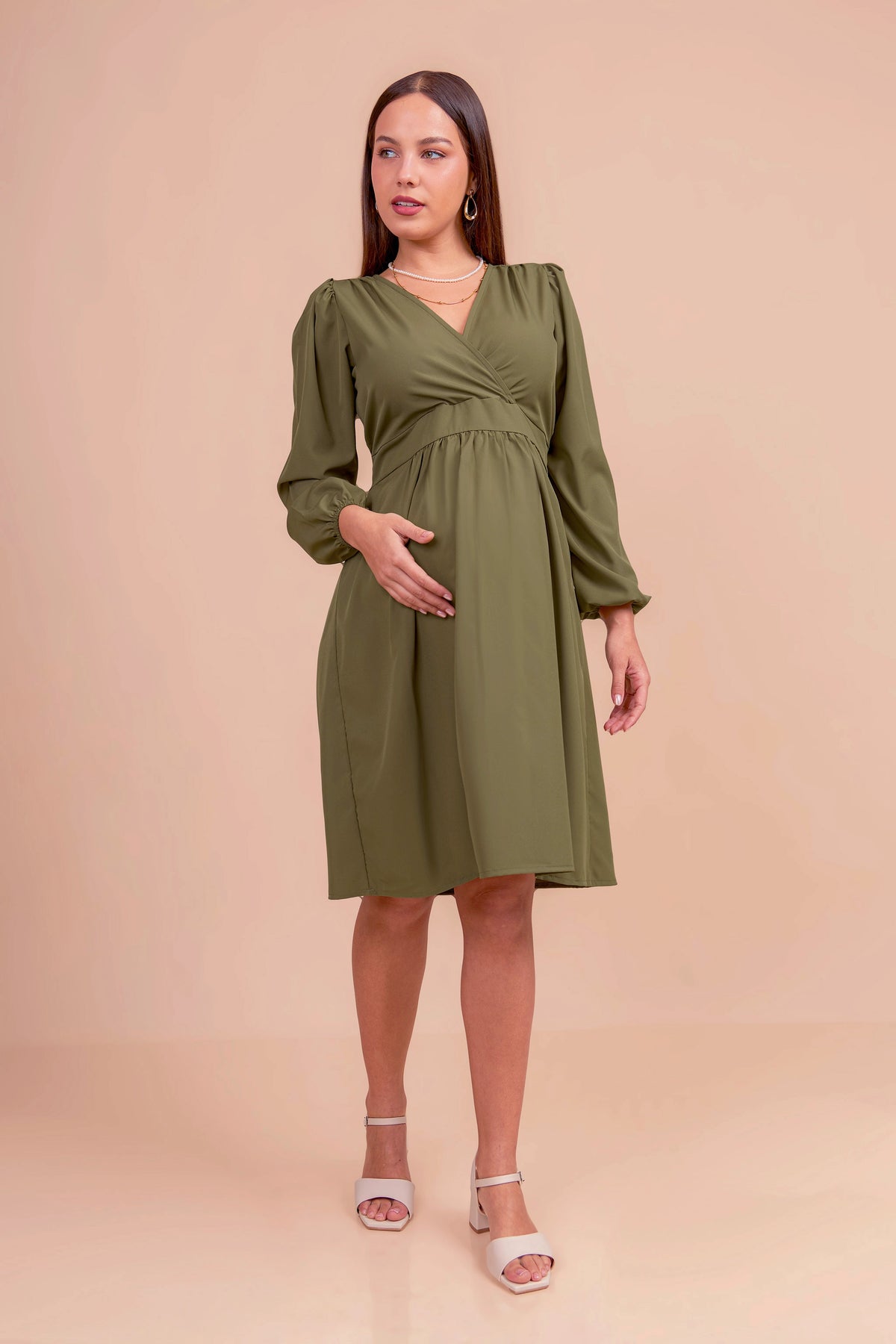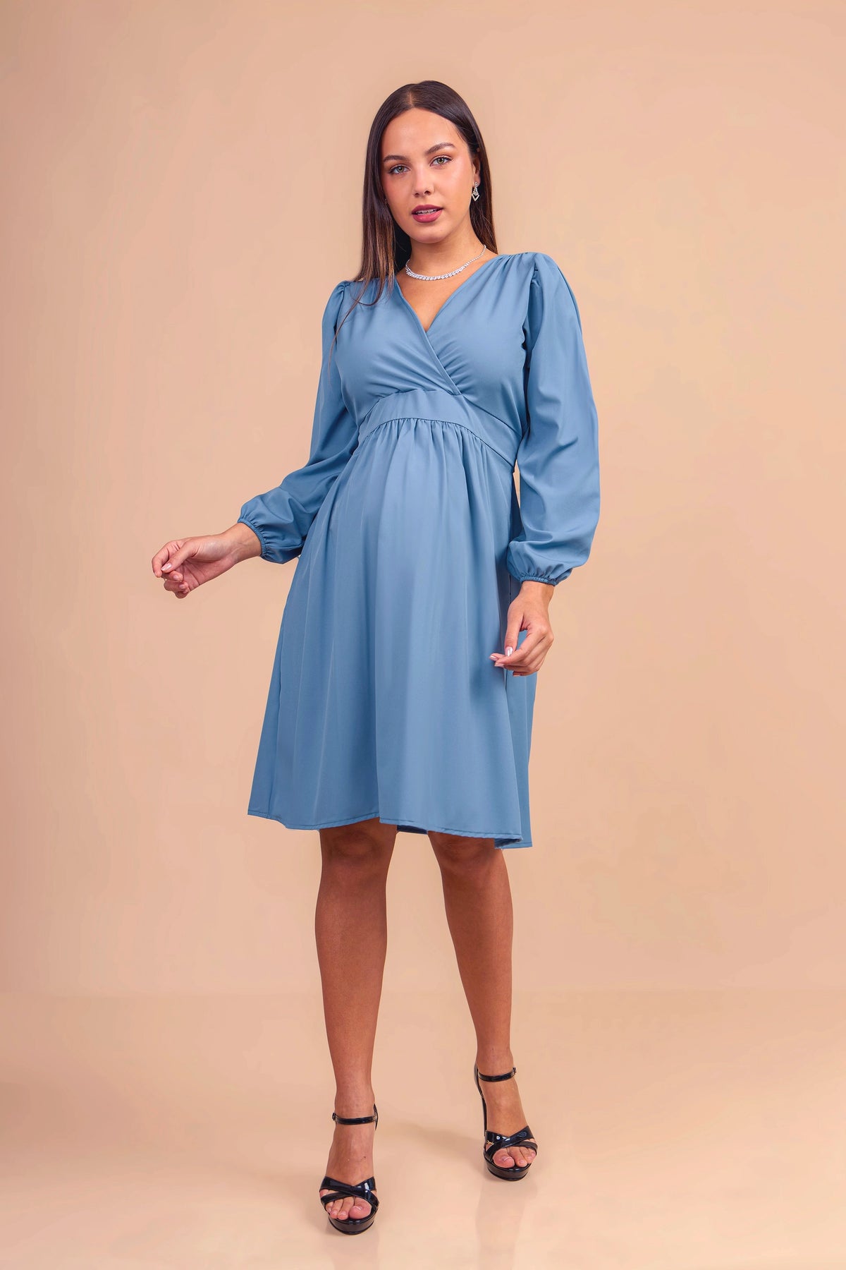 Realizado en tela seda, este vestido de maternidad ofrece una caída fluida y elegante. Con corte imperio que se adapta al crecimiento del vientre, escote cruzado en V y mangas largas con ligero volumen, es una prenda versátil y sofisticada para ocasiones formales o semi casuales.