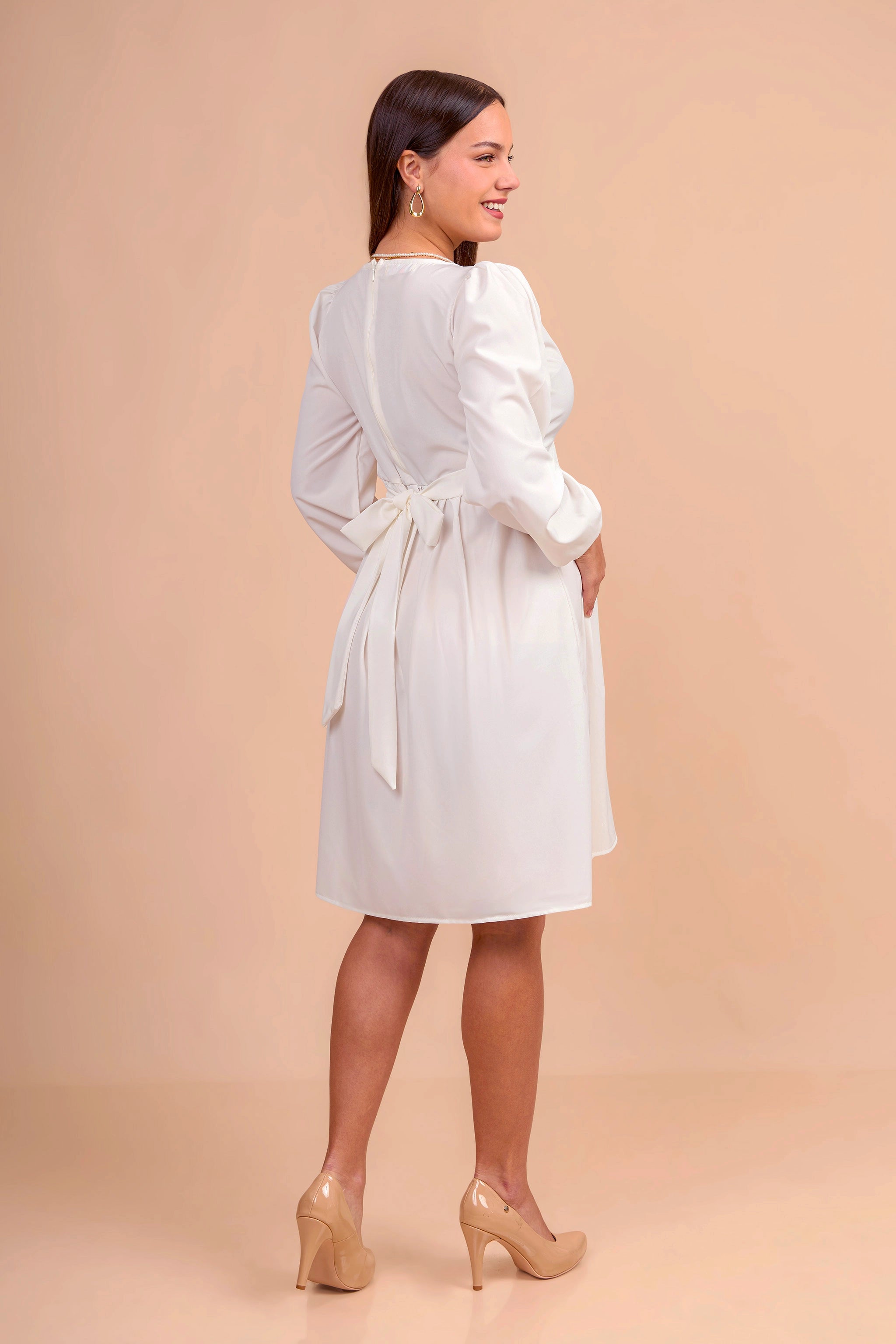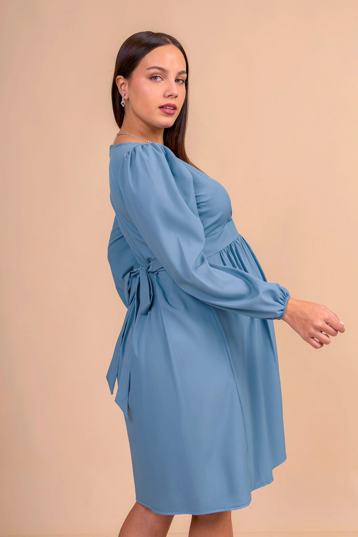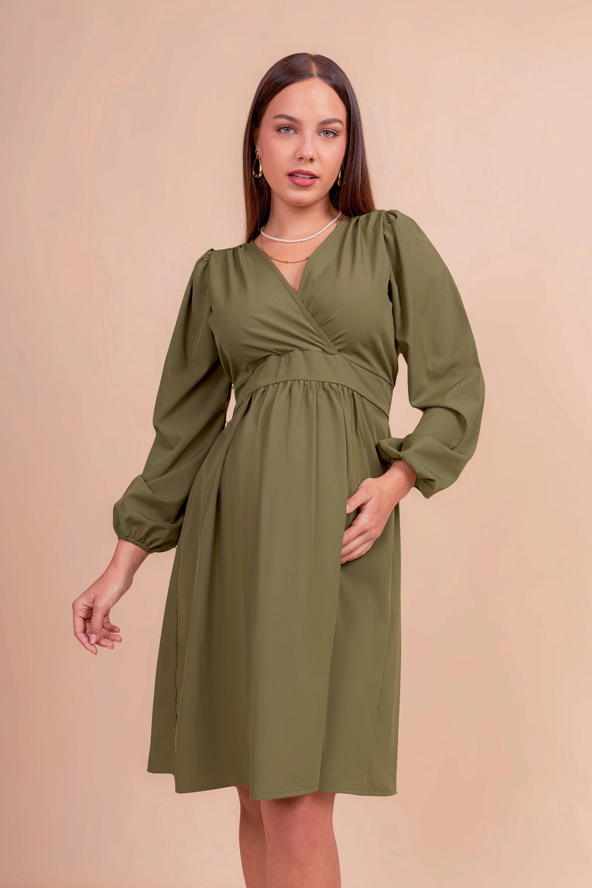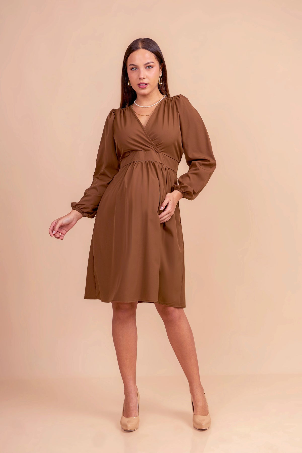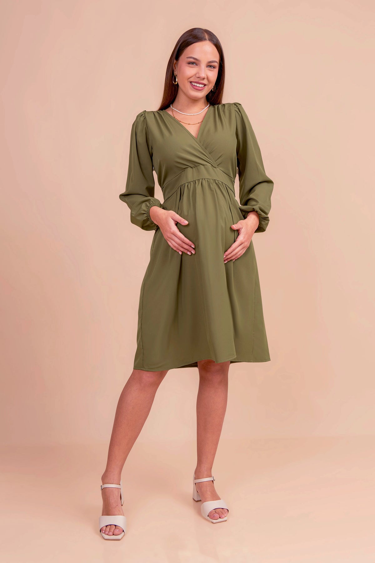Realizado en tela seda, este vestido de maternidad ofrece una caída fluida y elegante. Con corte imperio que se adapta al crecimiento del vientre, escote cruzado en V y mangas largas con ligero volumen, es una prenda versátil y sofisticada para ocasiones formales o semi casuales.