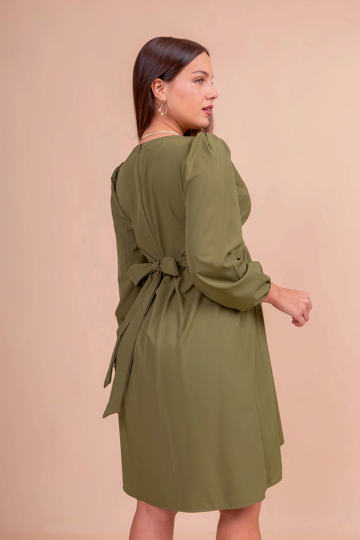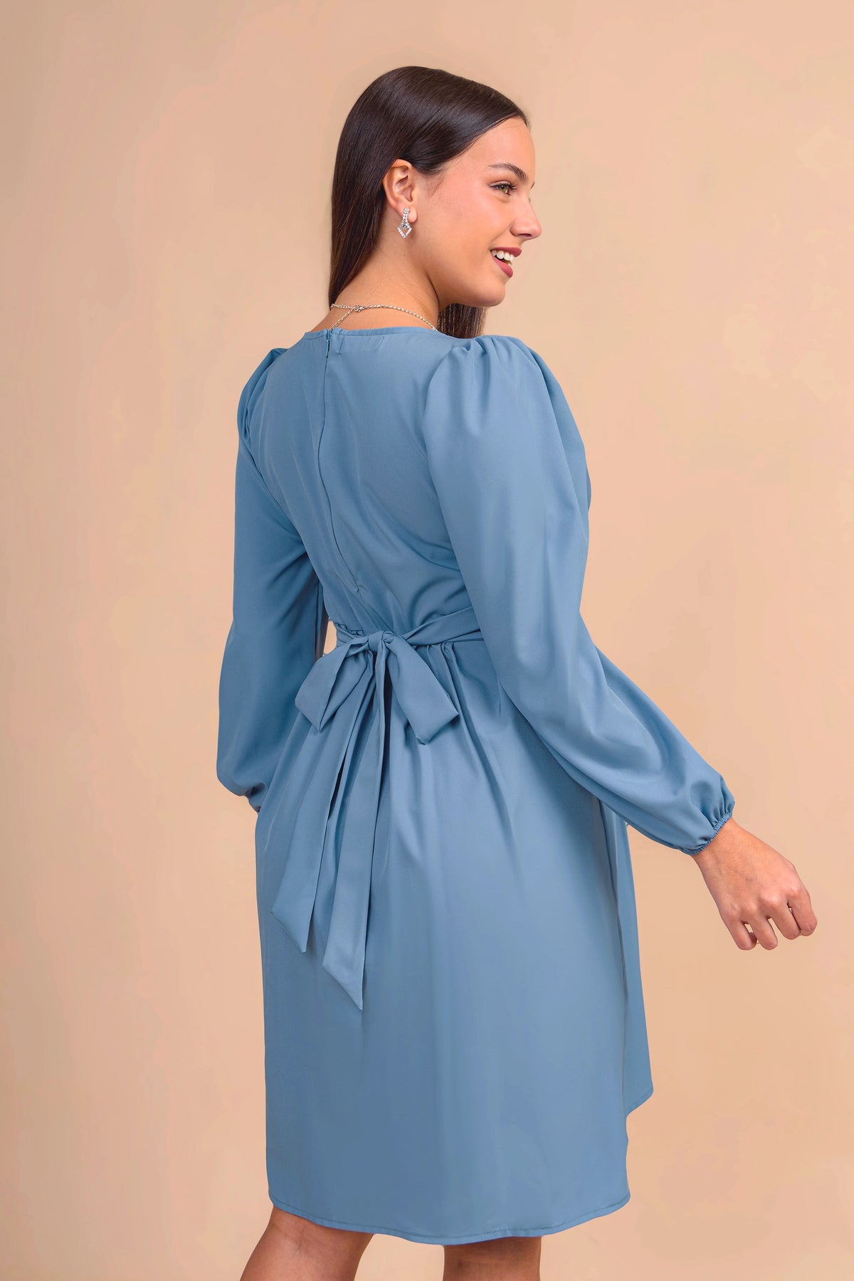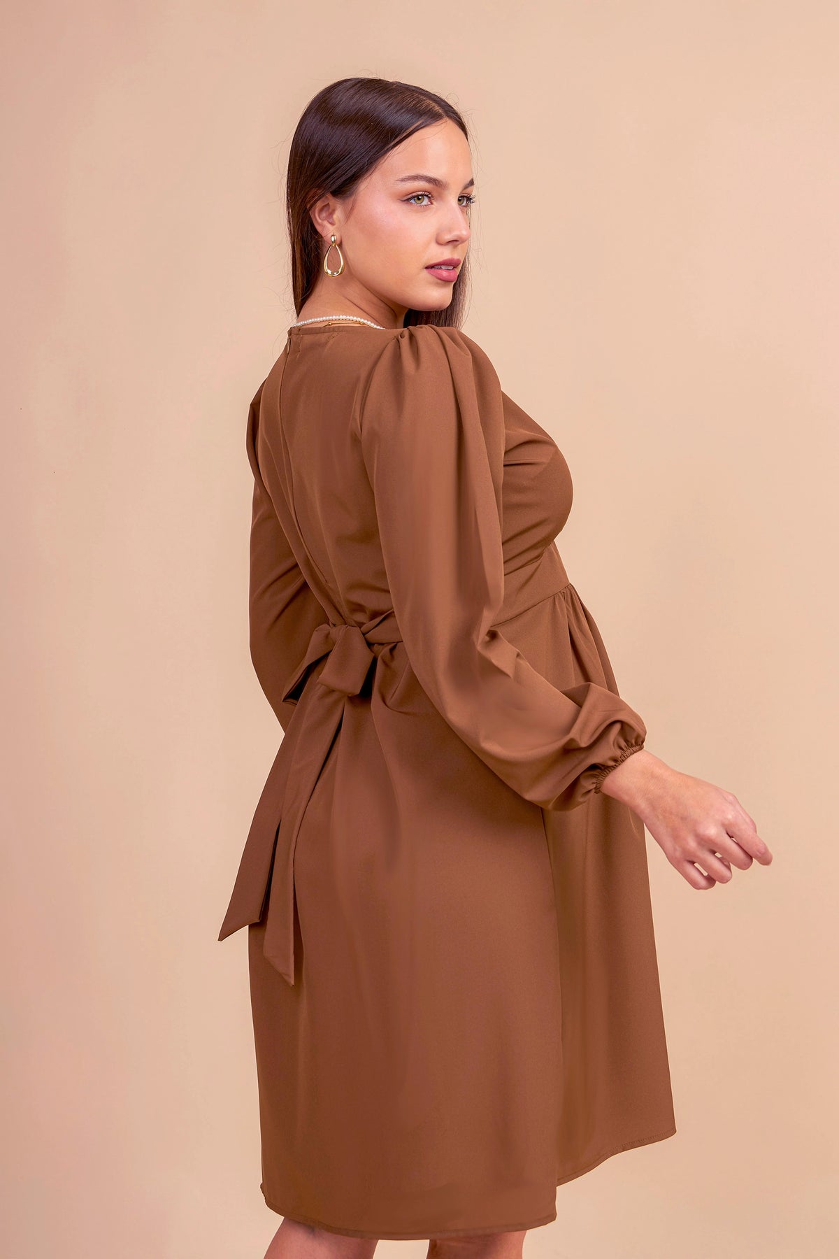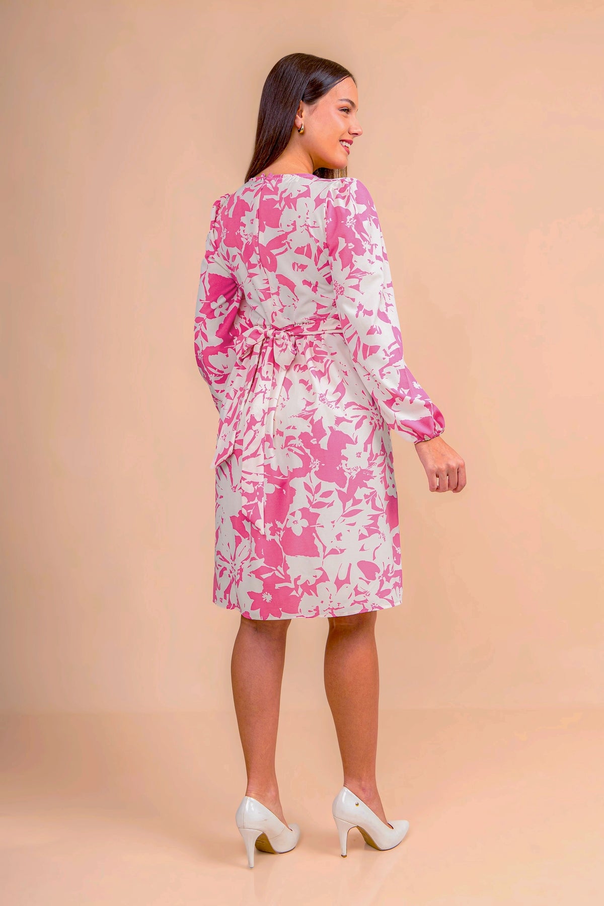 Realizado en tela seda, este vestido de maternidad ofrece una caída fluida y elegante. Con corte imperio que se adapta al crecimiento del vientre, escote cruzado en V y mangas largas con ligero volumen, es una prenda versátil y sofisticada para ocasiones formales o semi casuales.