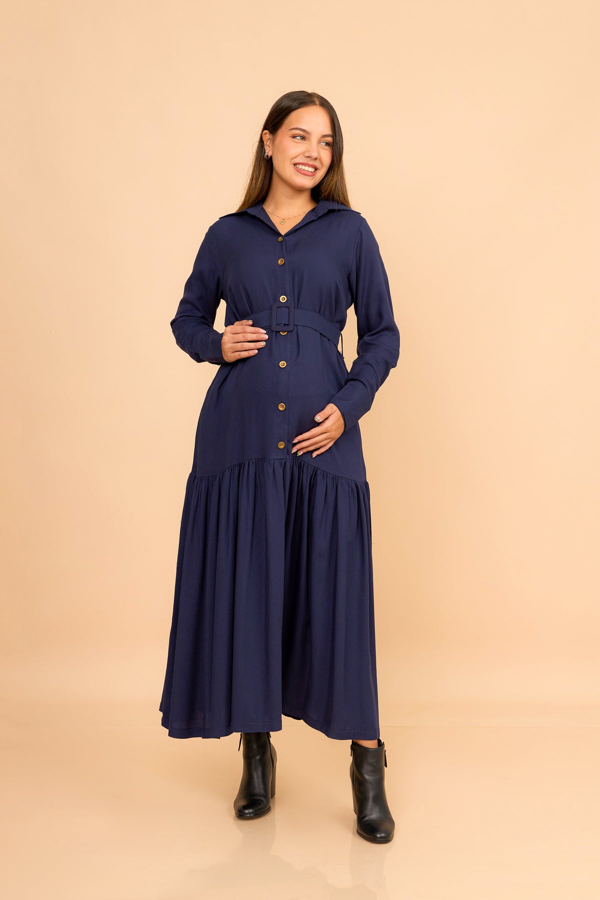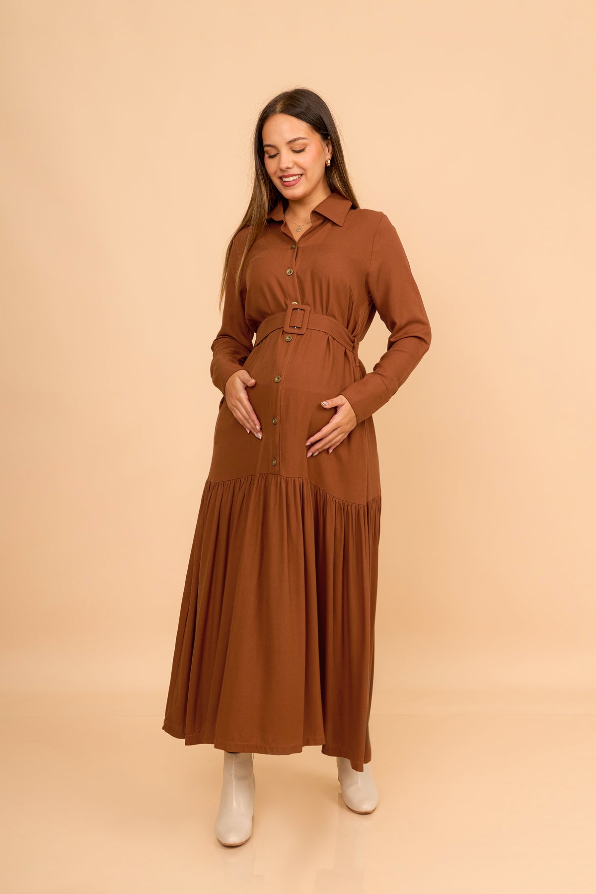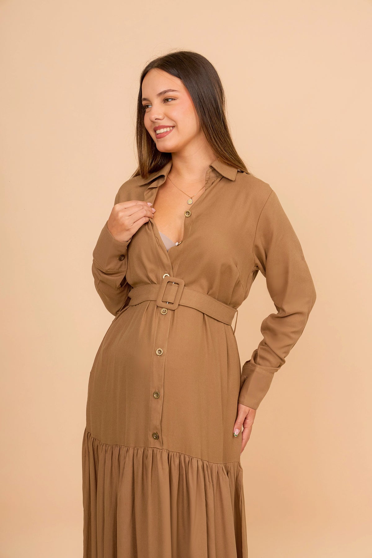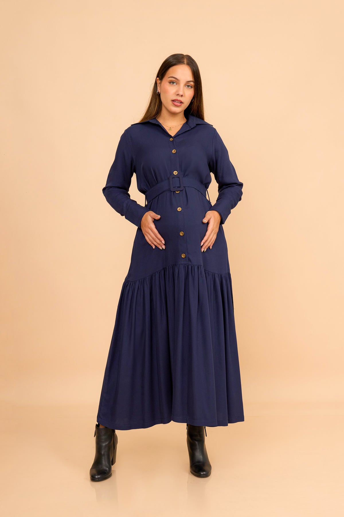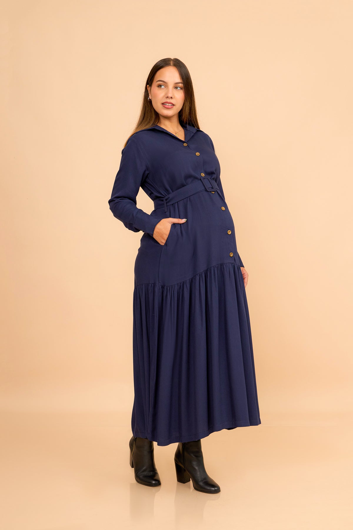 El equilibrio ideal entre elegancia y funcionalidad. El vestido Sienna está diseñado para acompañarte durante el embarazo con estilo y comodidad. Su corte camisero con botones frontales, cuello clásico y cinturón en la misma tela estiliza suavemente la figura, mientras que la falda con vuelo aporta movimiento y ligereza. Además, cuenta con bolsillos laterales que suman practicidad sin perder sofisticación.