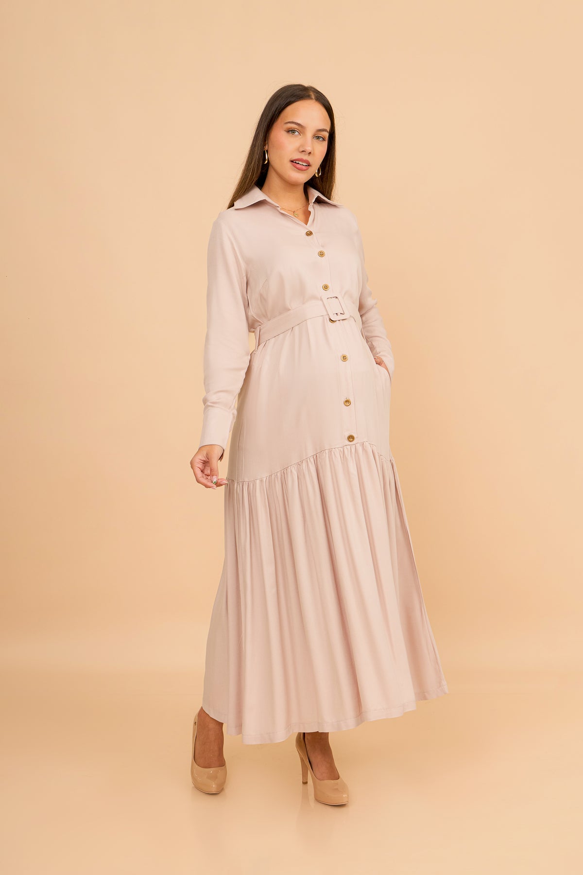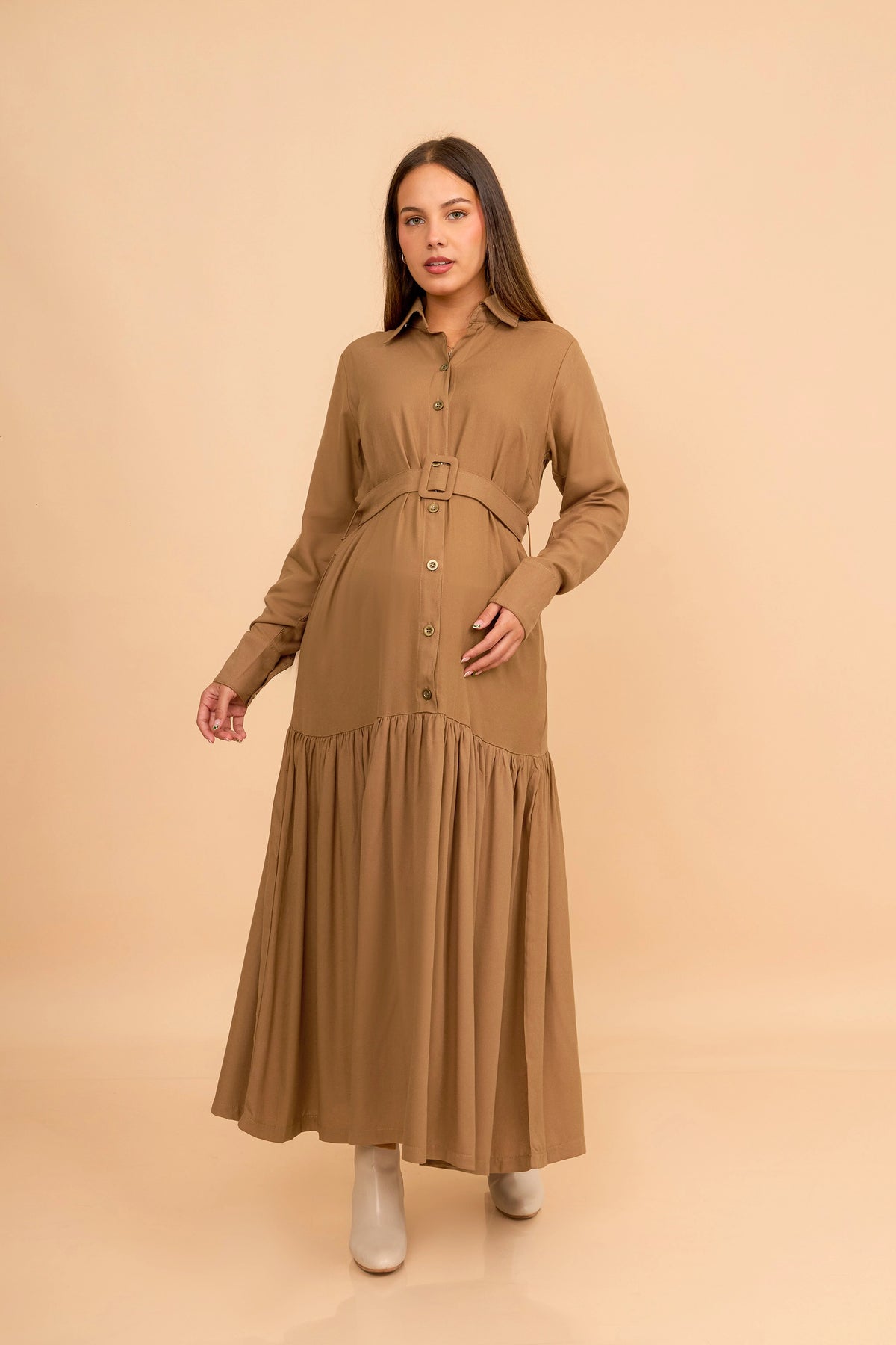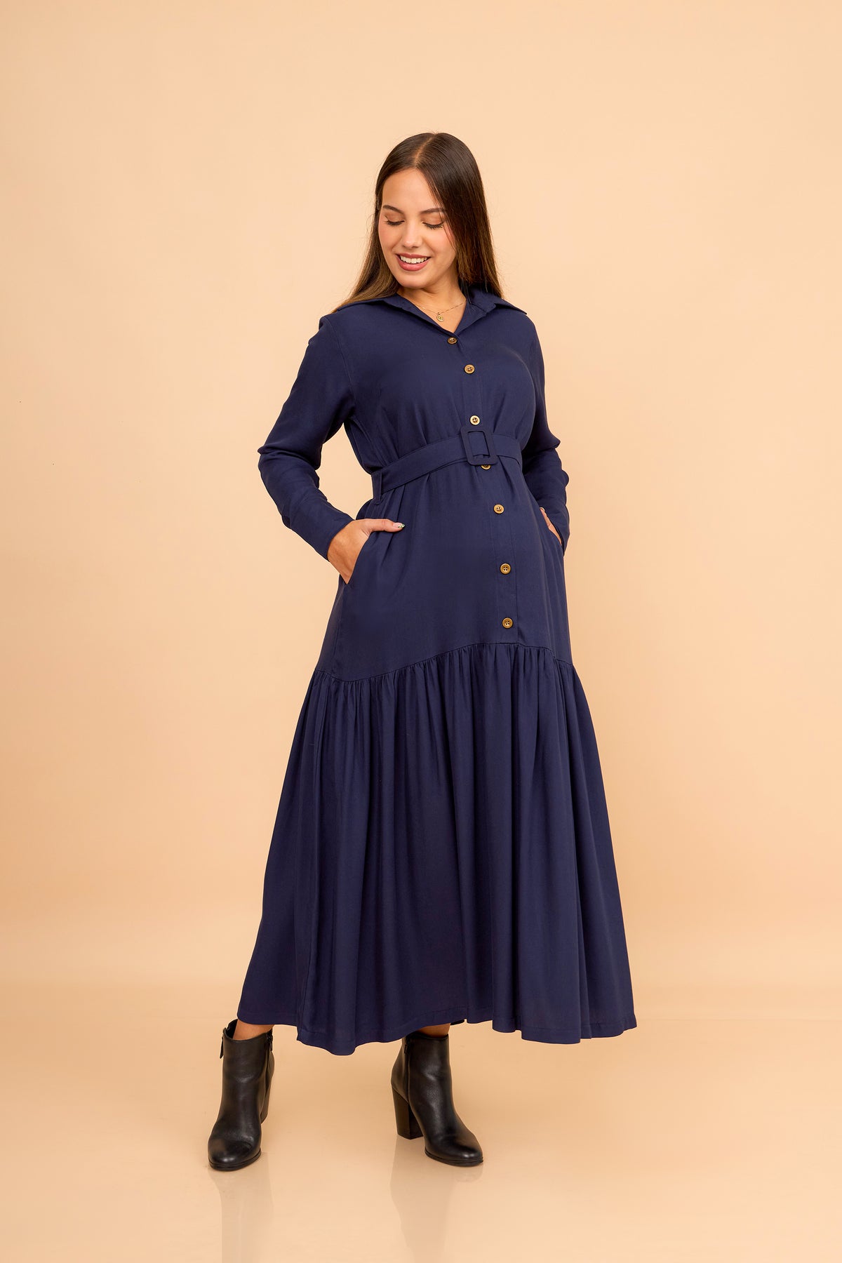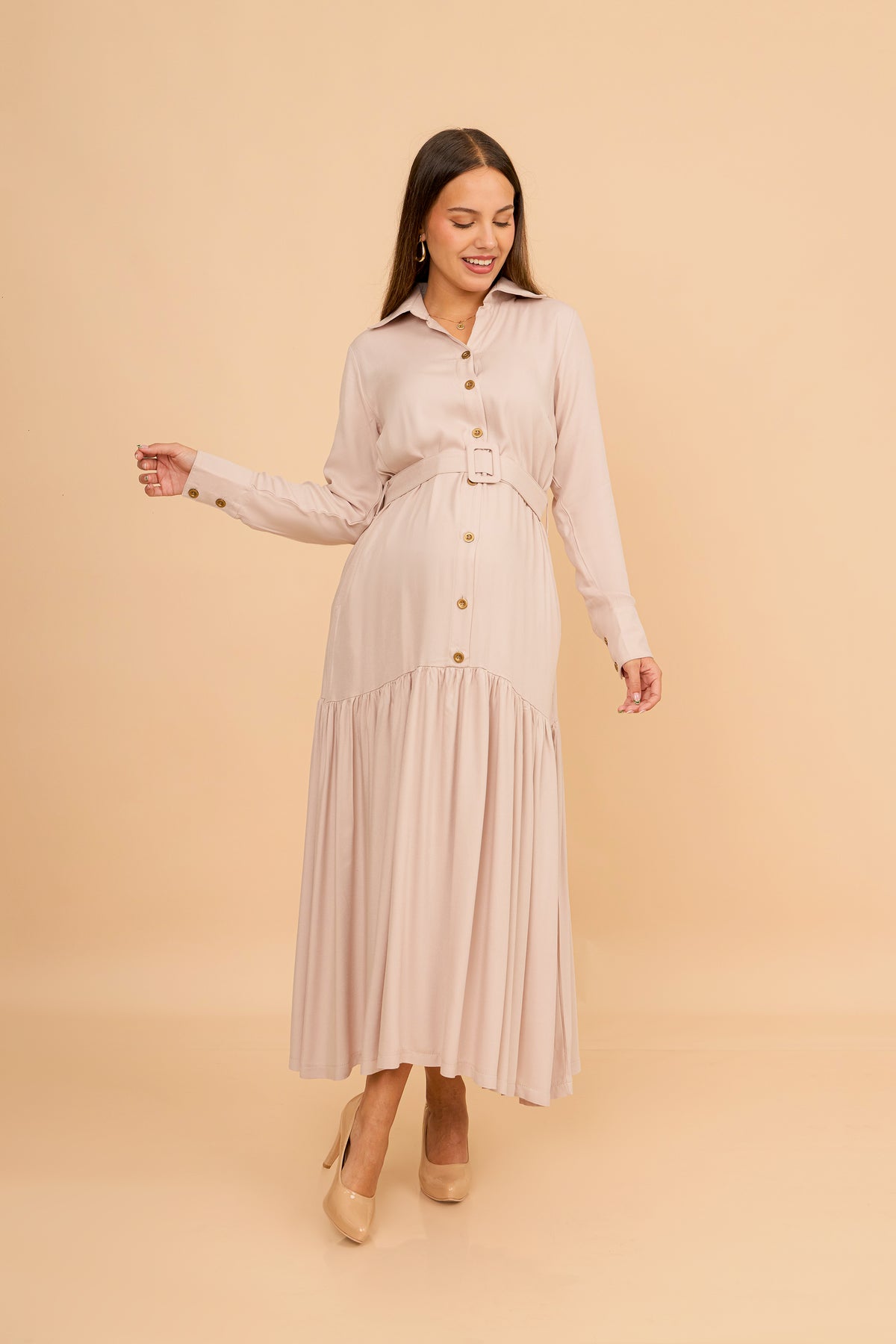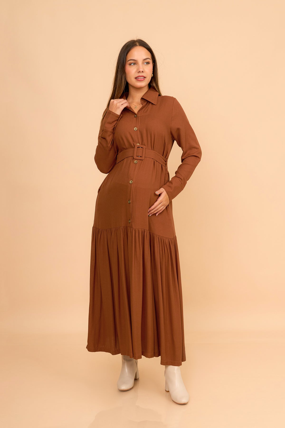 El equilibrio ideal entre elegancia y funcionalidad. El vestido Sienna está diseñado para acompañarte durante el embarazo con estilo y comodidad. Su corte camisero con botones frontales, cuello clásico y cinturón en la misma tela estiliza suavemente la figura, mientras que la falda con vuelo aporta movimiento y ligereza. Además, cuenta con bolsillos laterales que suman practicidad sin perder sofisticación.