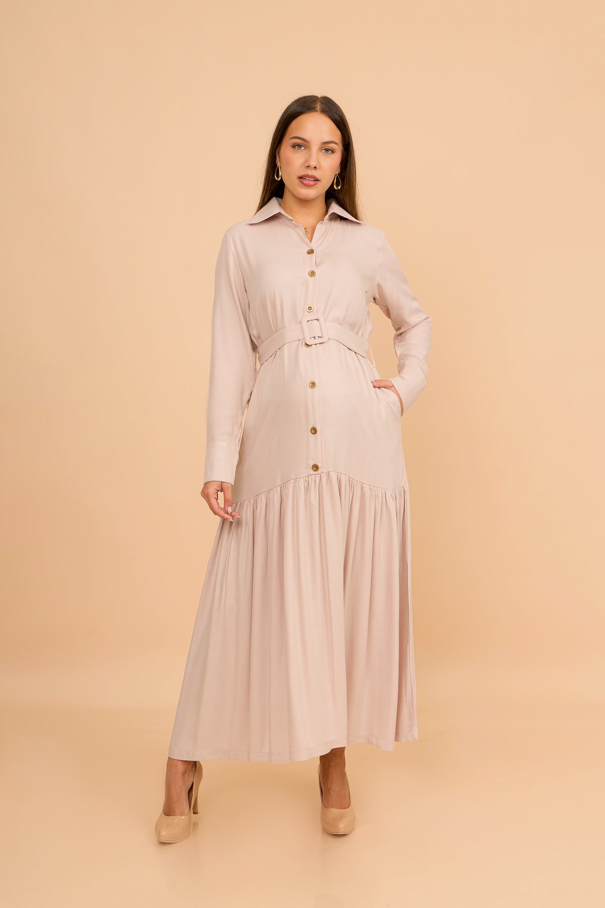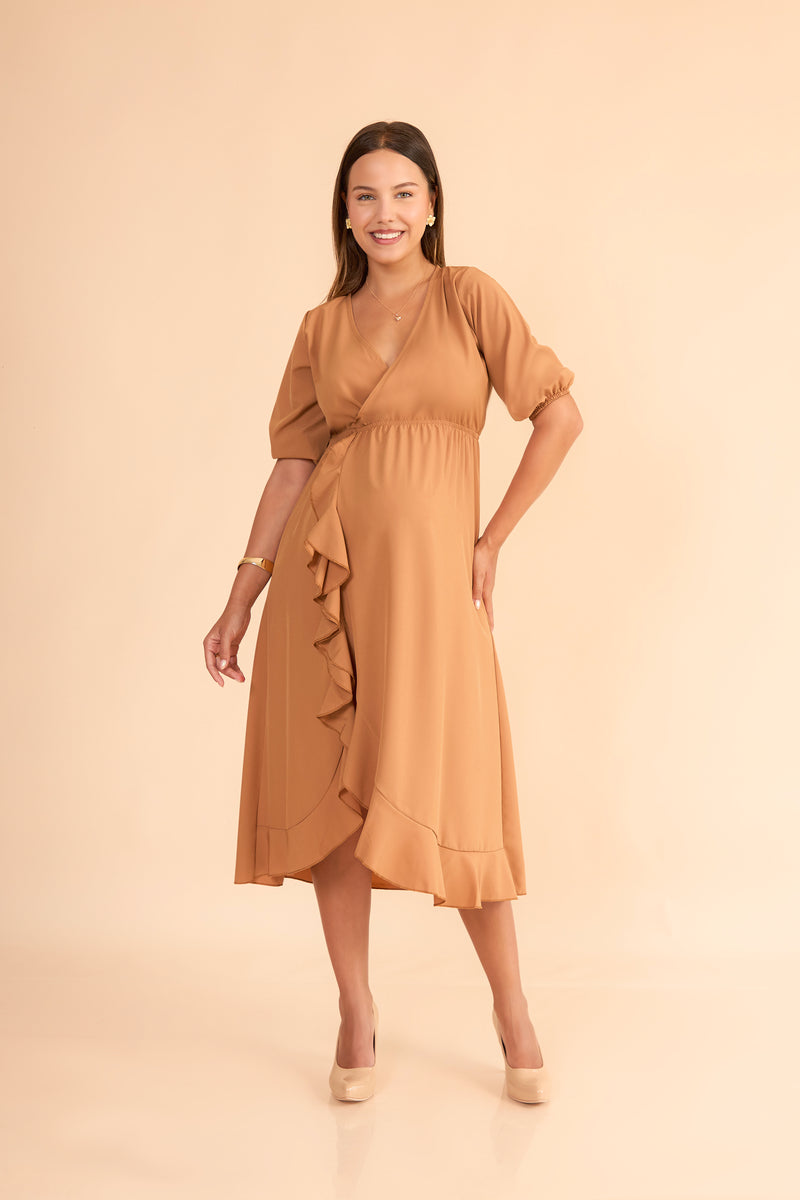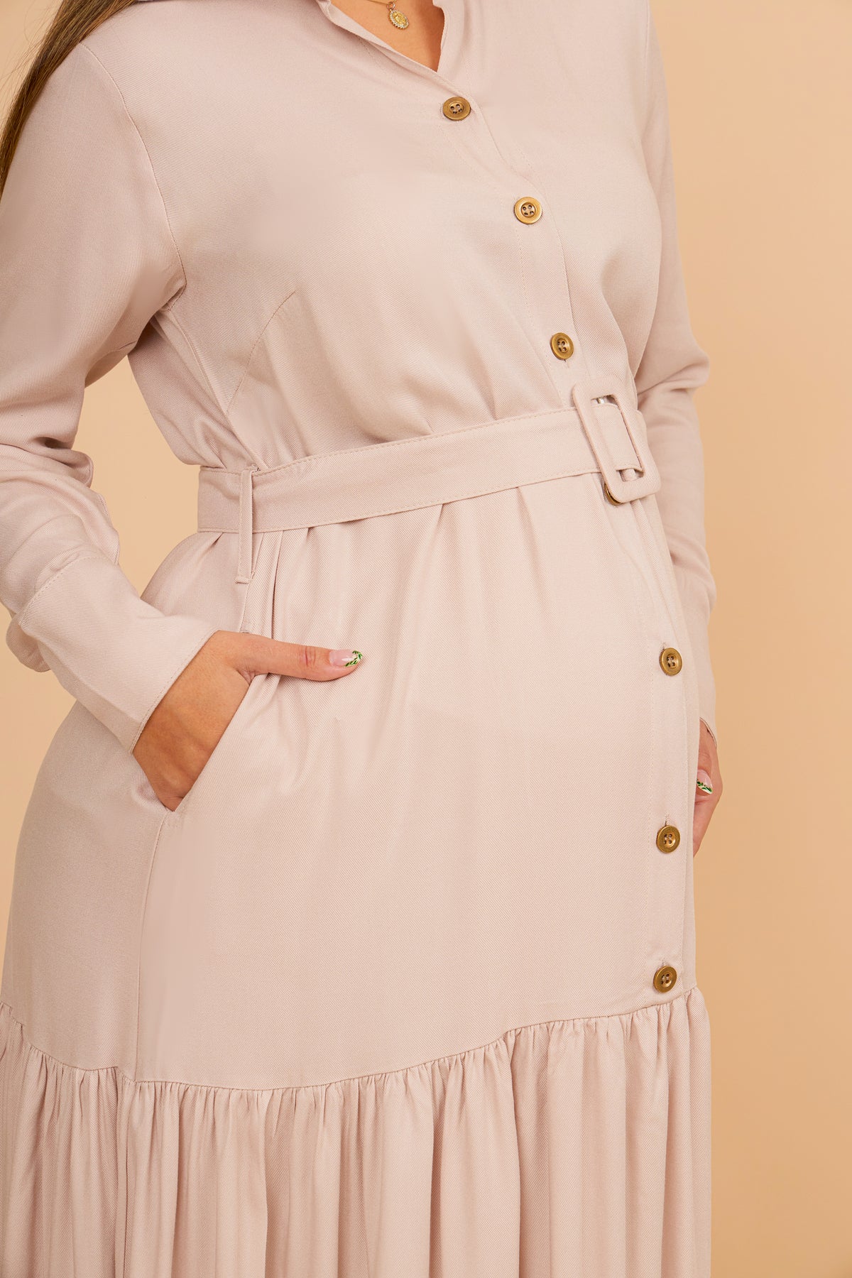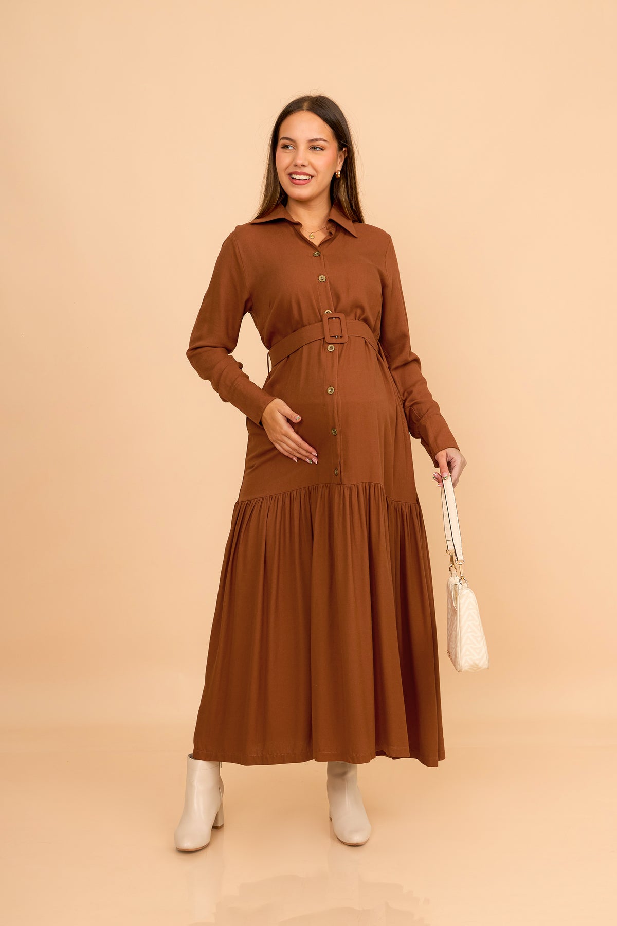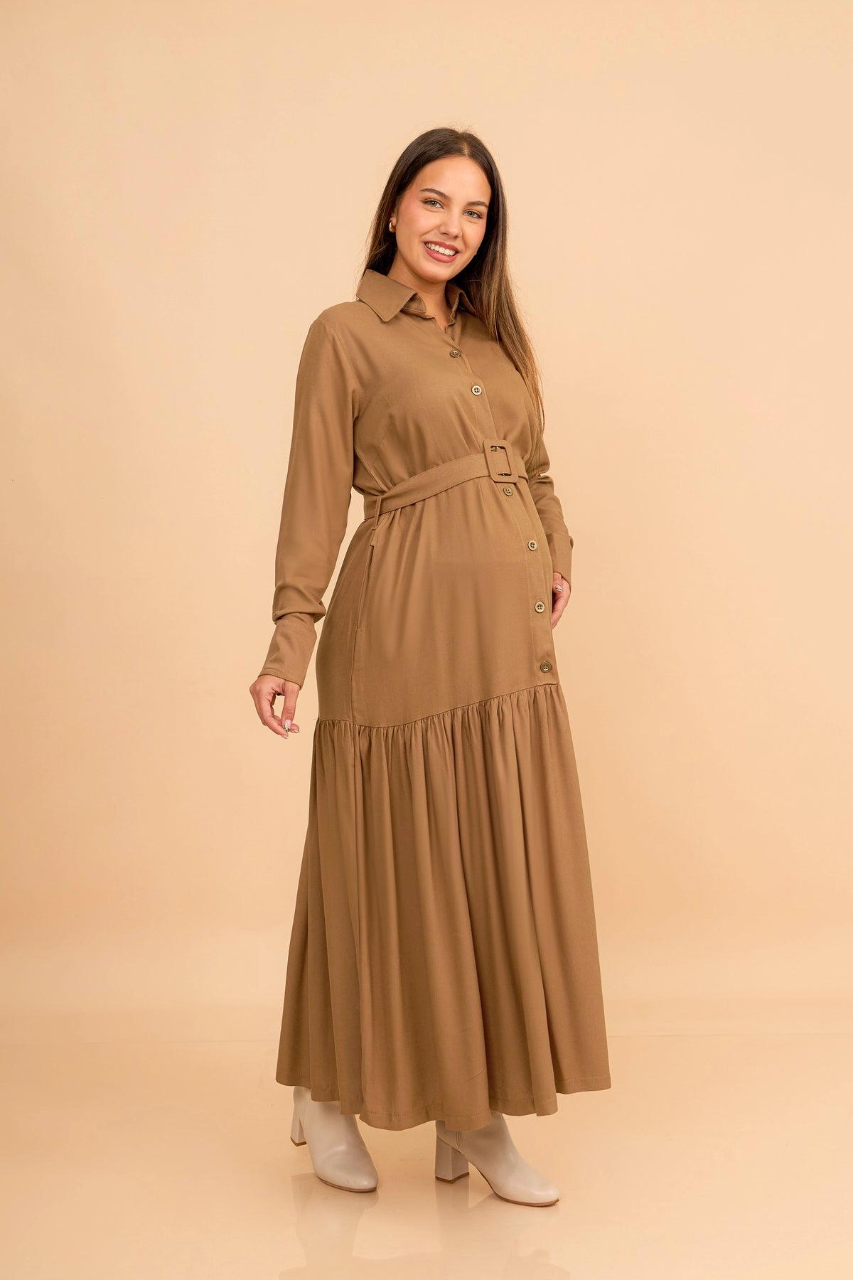 El equilibrio ideal entre elegancia y funcionalidad. El vestido Sienna está diseñado para acompañarte durante el embarazo con estilo y comodidad. Su corte camisero con botones frontales, cuello clásico y cinturón en la misma tela estiliza suavemente la figura, mientras que la falda con vuelo aporta movimiento y ligereza. Además, cuenta con bolsillos laterales que suman practicidad sin perder sofisticación.