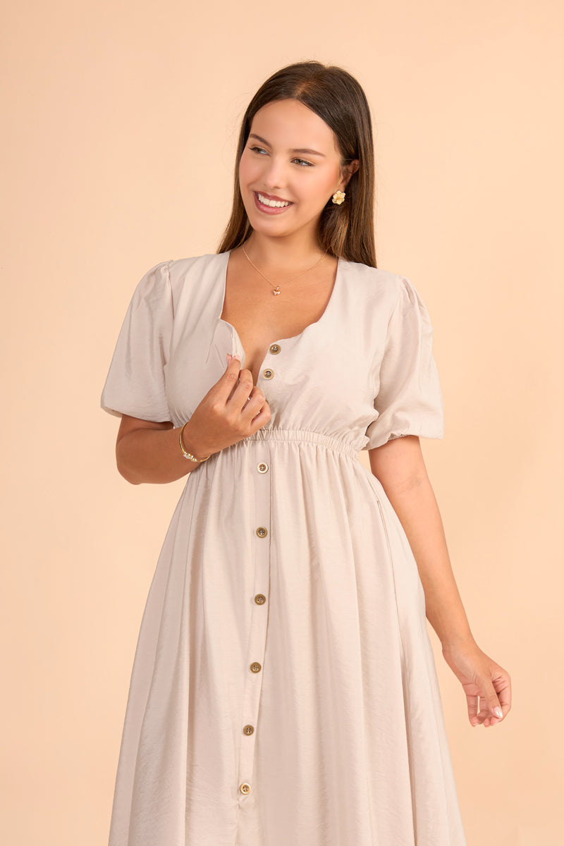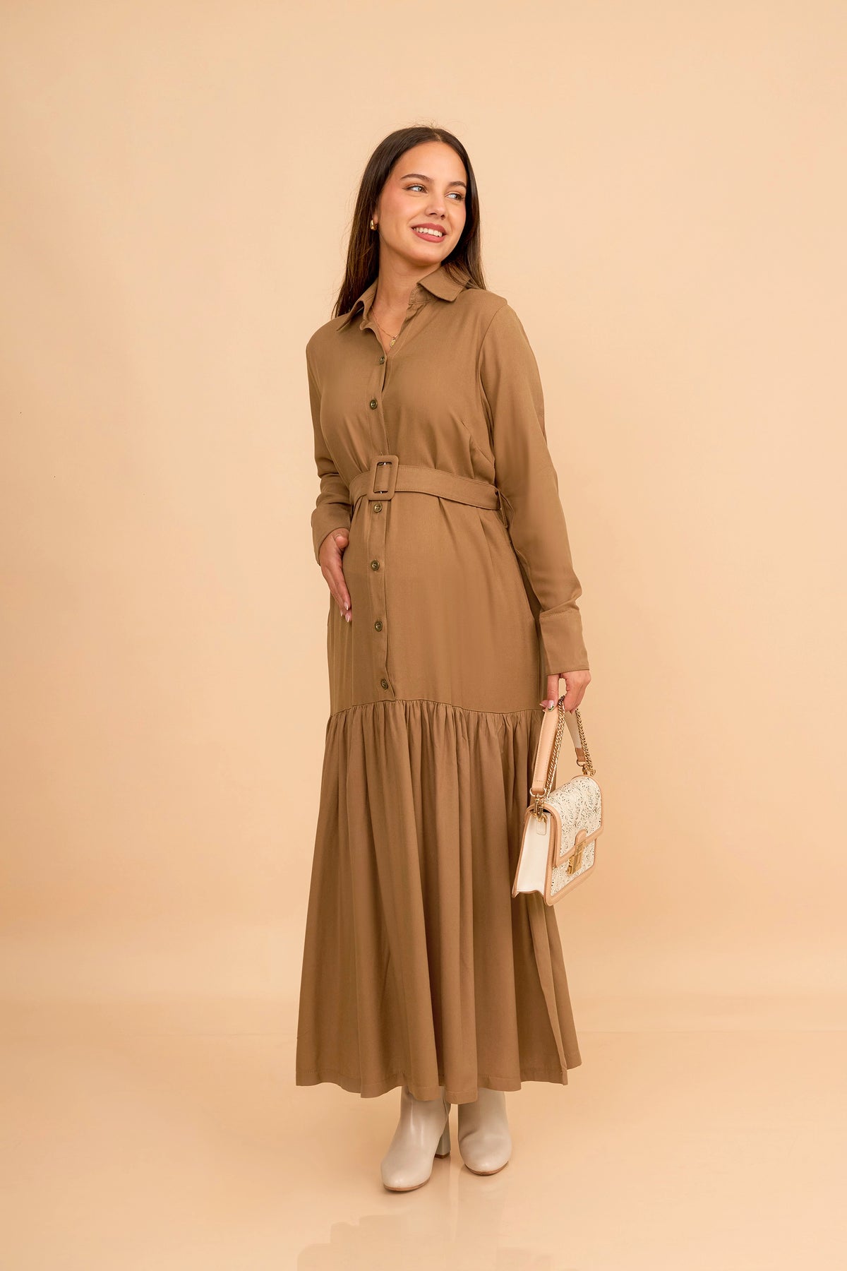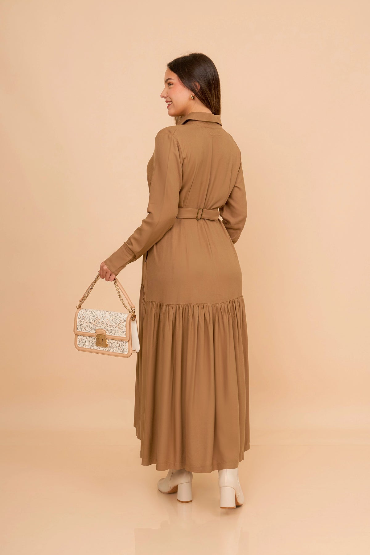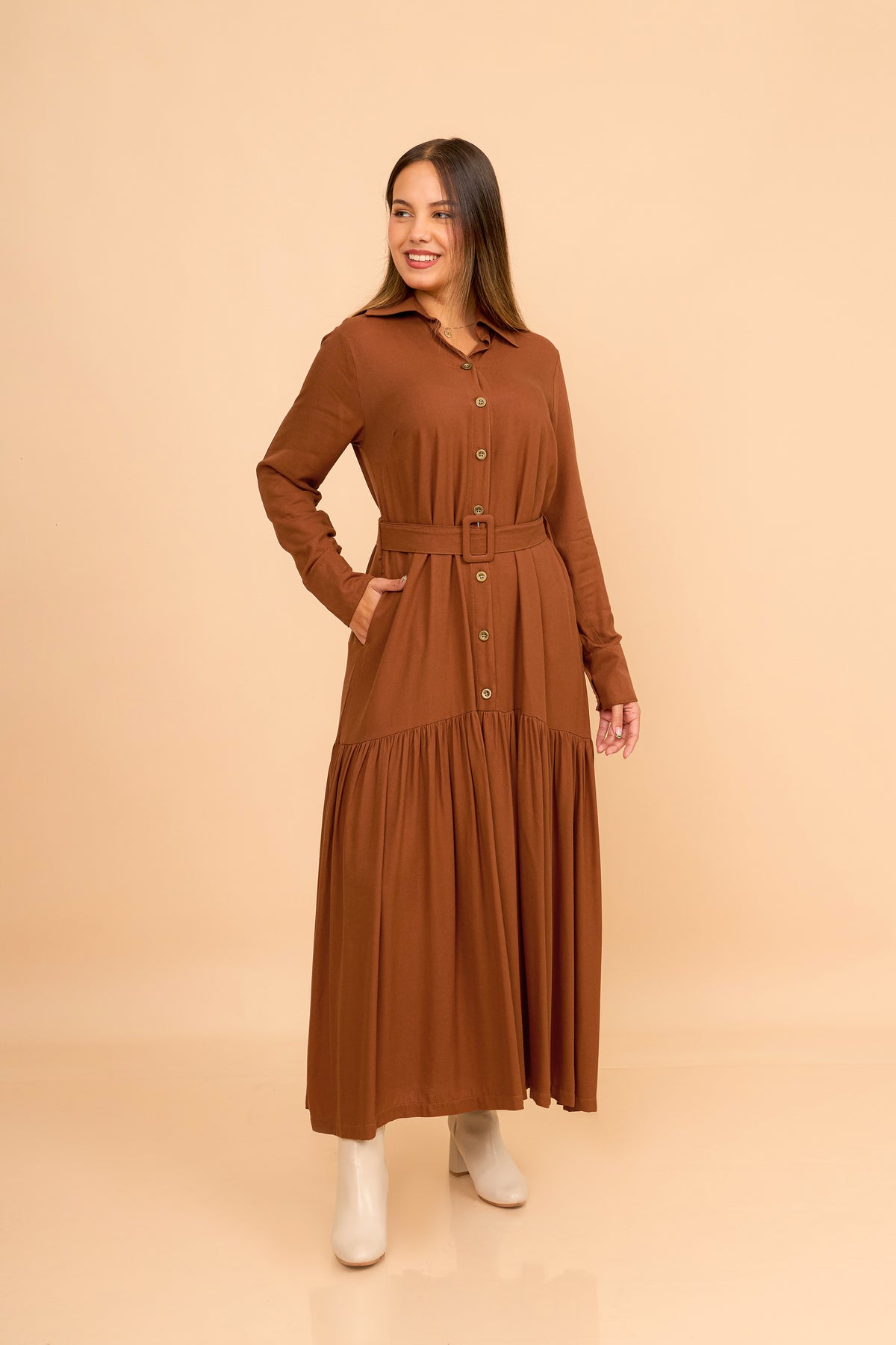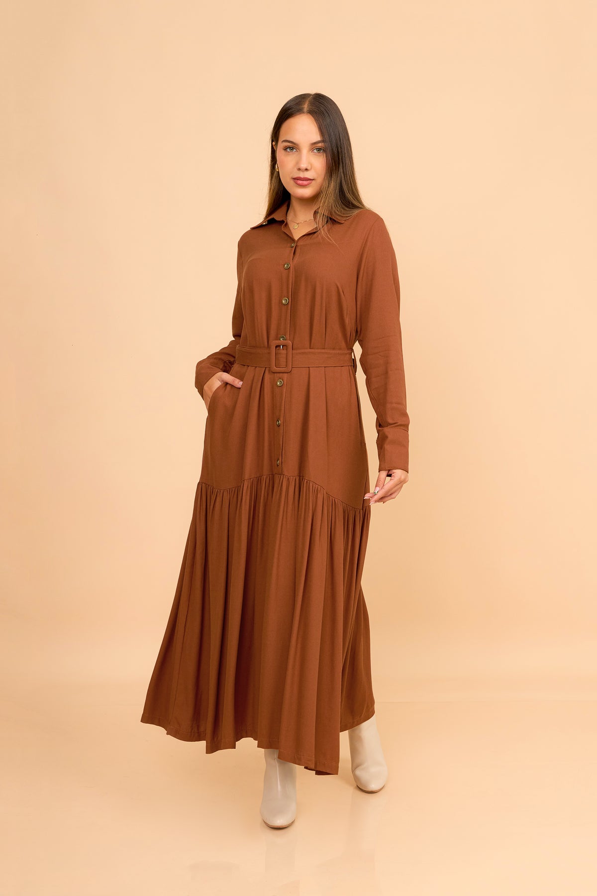El equilibrio ideal entre elegancia y funcionalidad. El vestido Sienna está diseñado para acompañarte durante el embarazo con estilo y comodidad. Su corte camisero con botones frontales, cuello clásico y cinturón en la misma tela estiliza suavemente la figura, mientras que la falda con vuelo aporta movimiento y ligereza. Además, cuenta con bolsillos laterales que suman practicidad sin perder sofisticación.