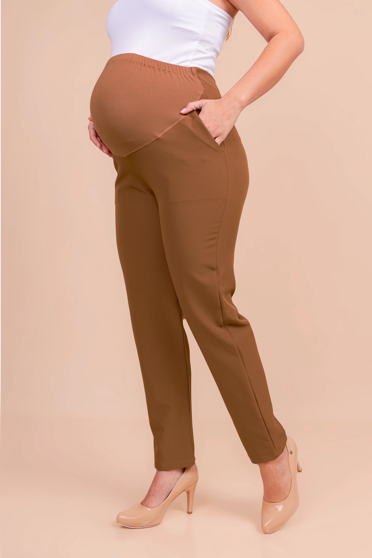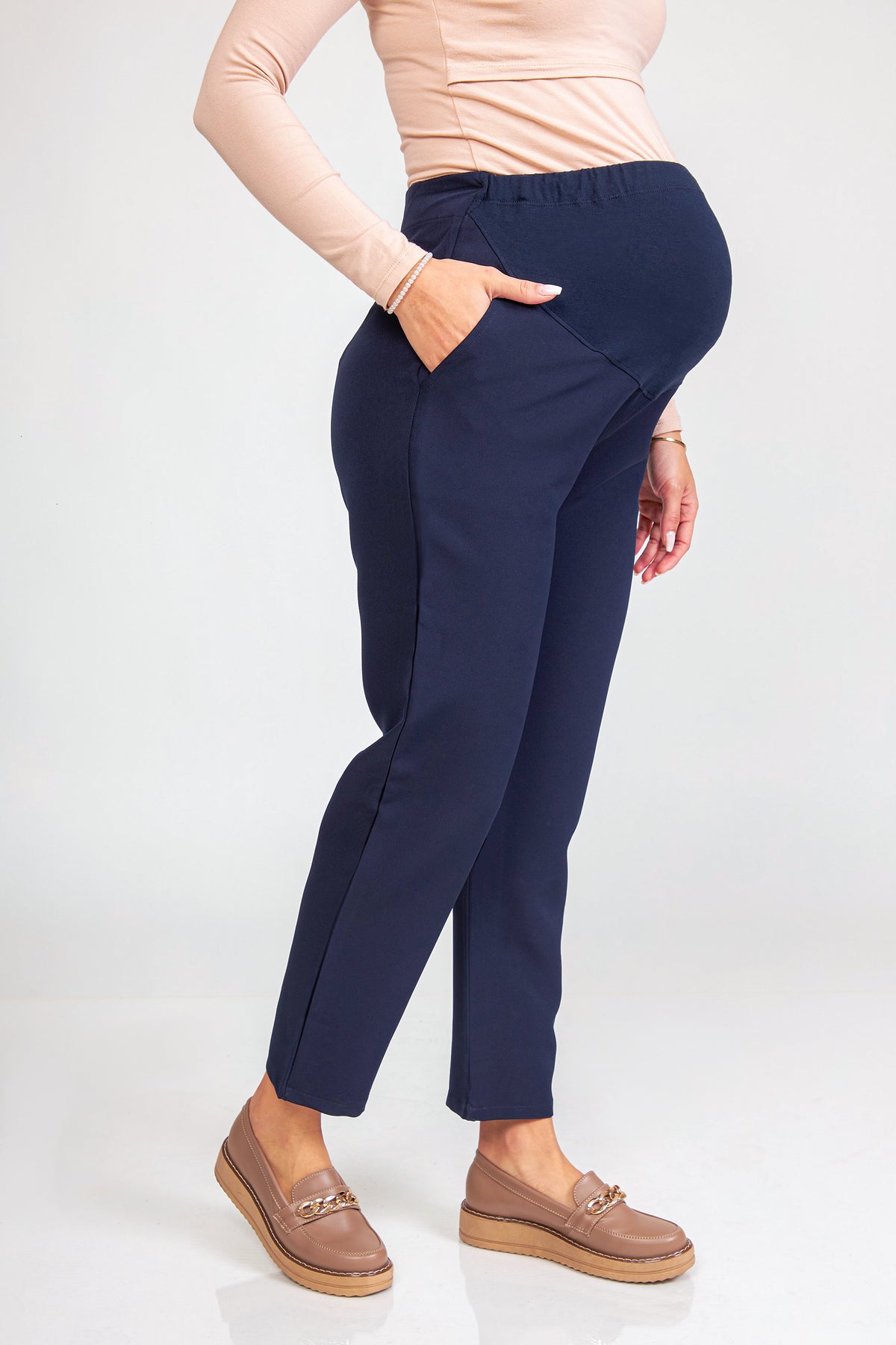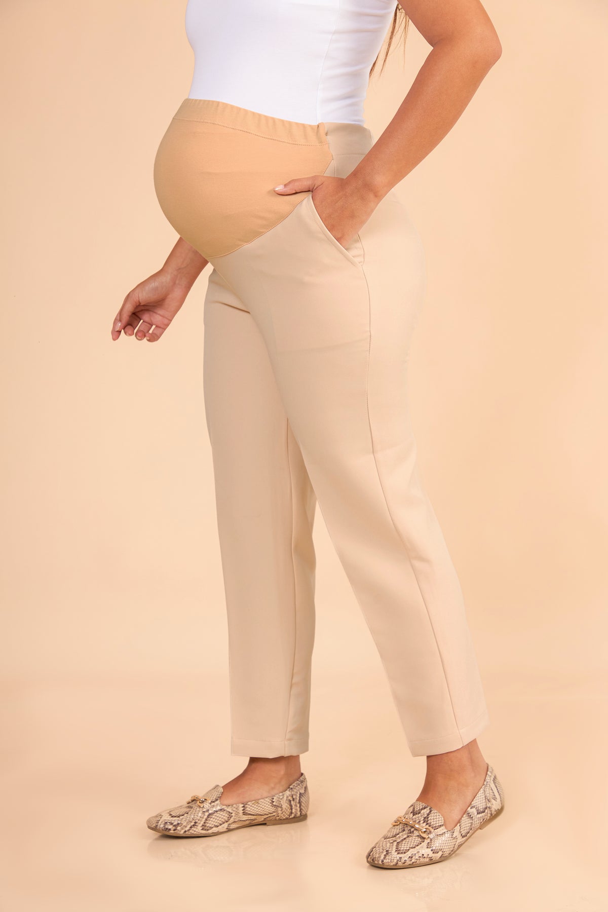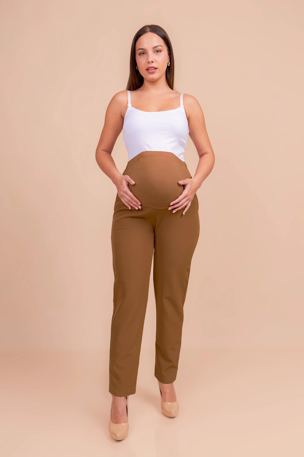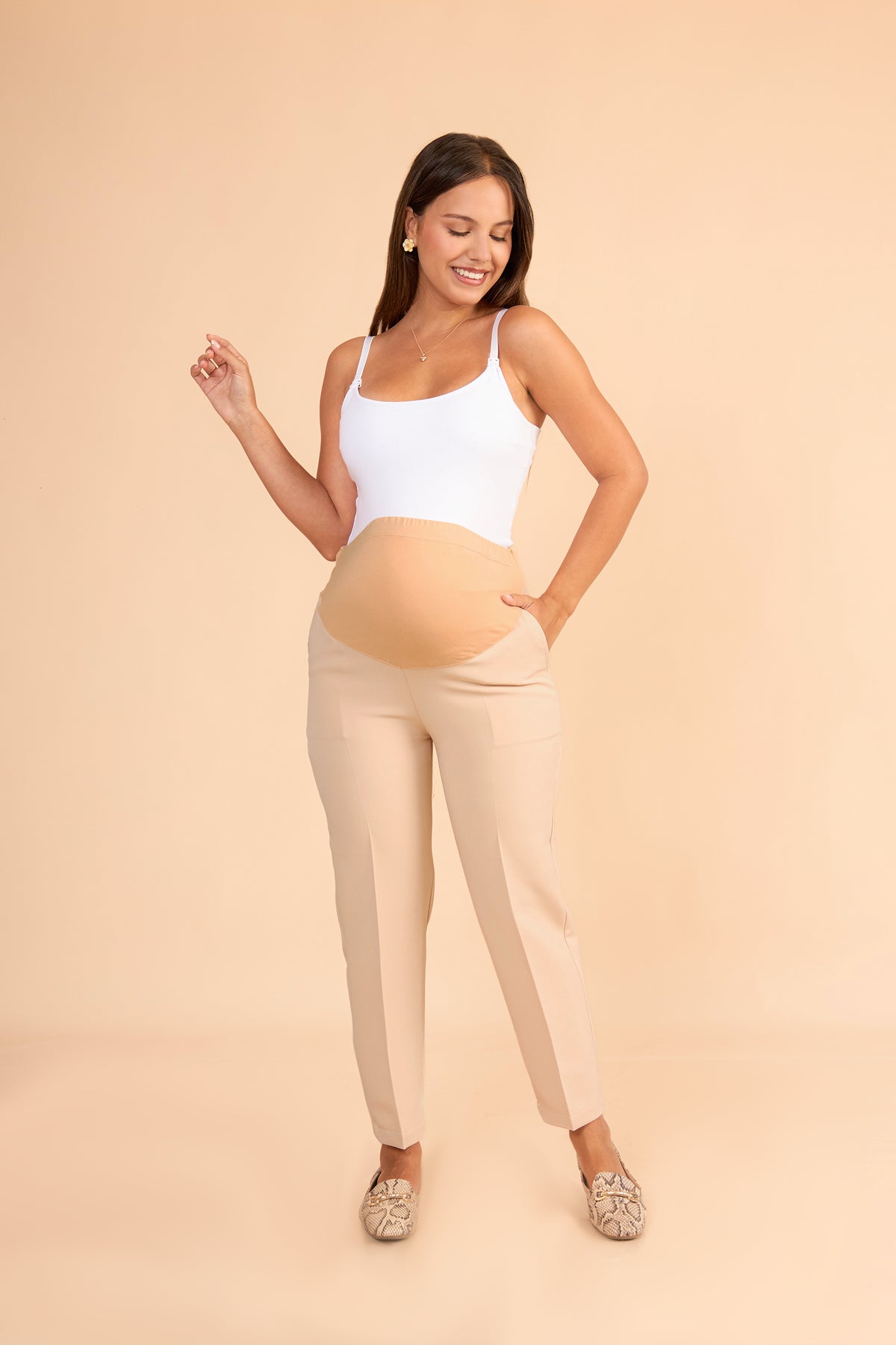 Pantalón con regulador en la cintura. Pantalón Básico de vestir con espalda alta lleva pinzas y vuelta para entallar el cuerpo, en la parte delantera cuenta con una barriguita de algodón que se va adaptando a tu embarazo, lleva bolsillos diagonales en la parte delantero.