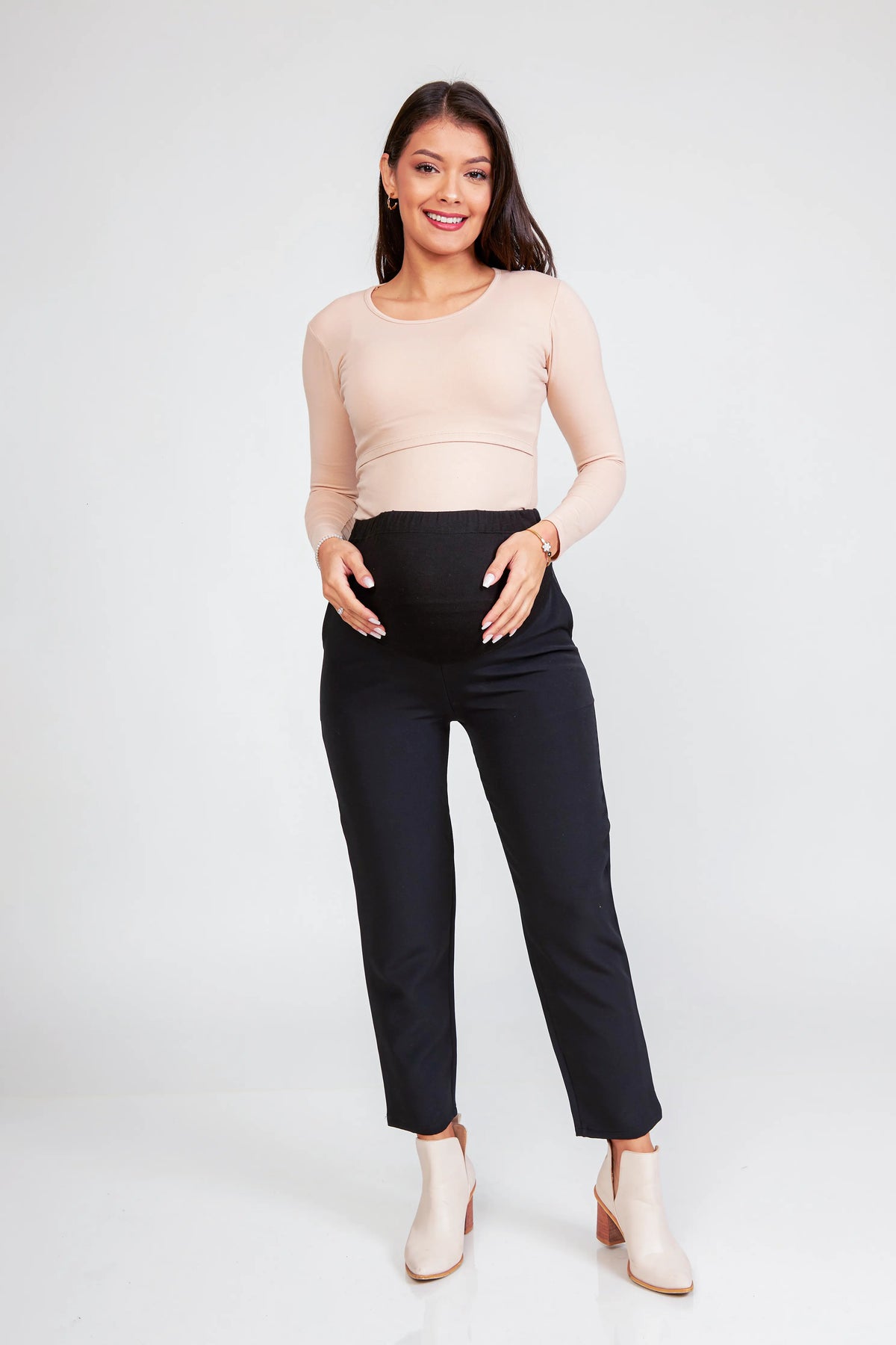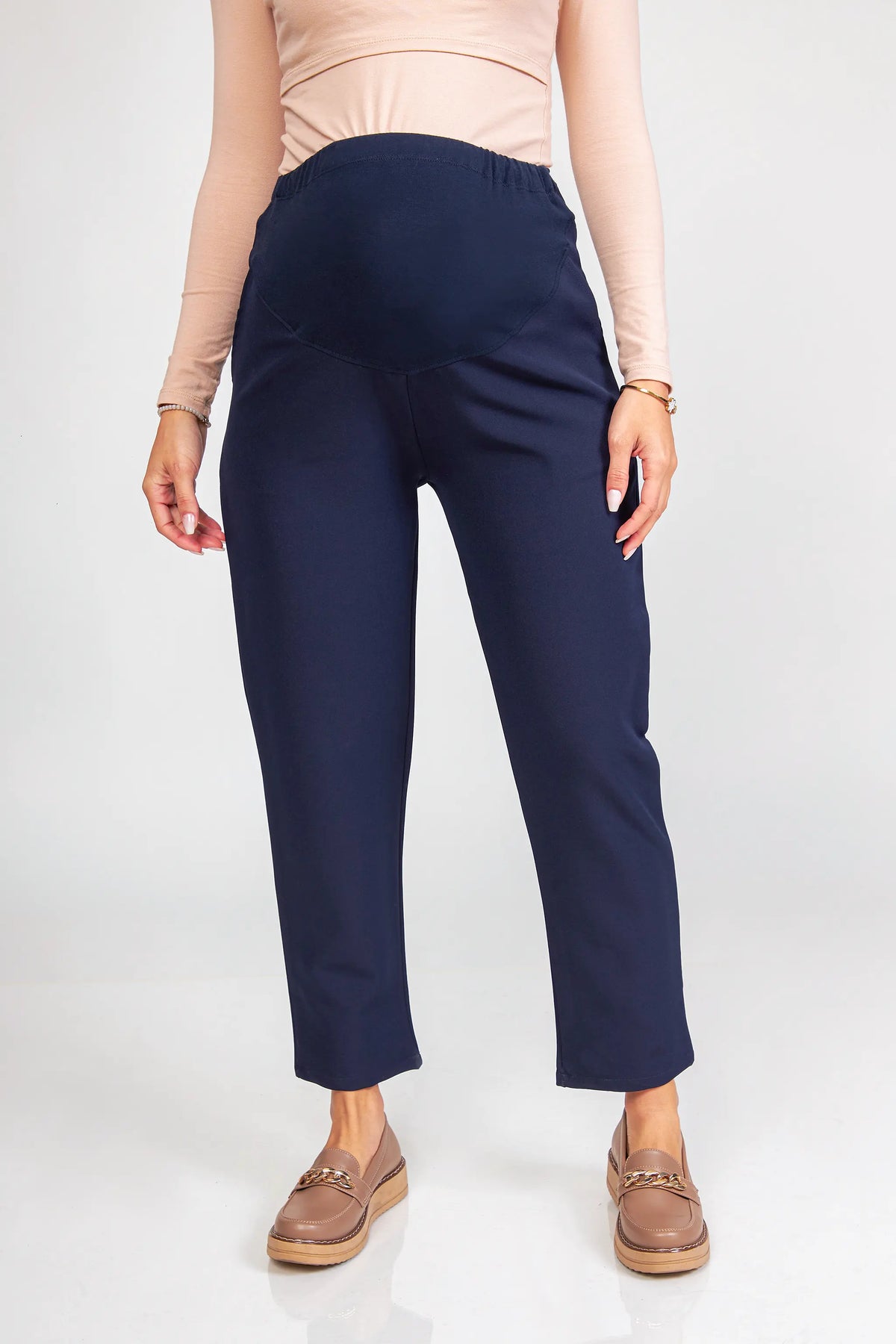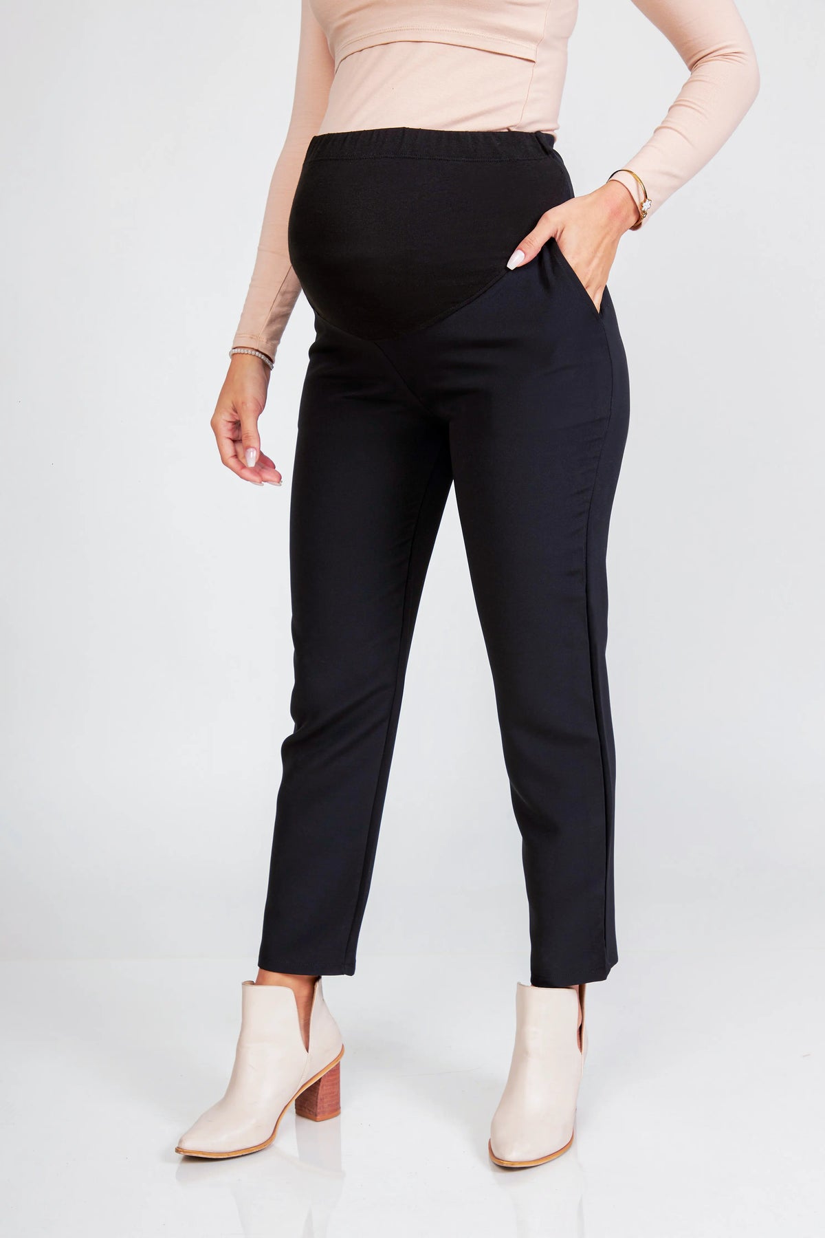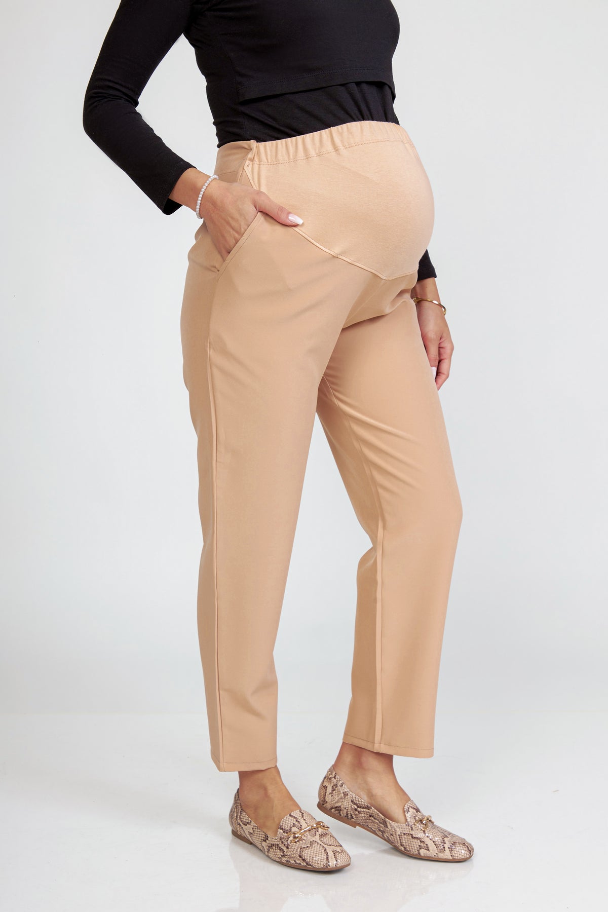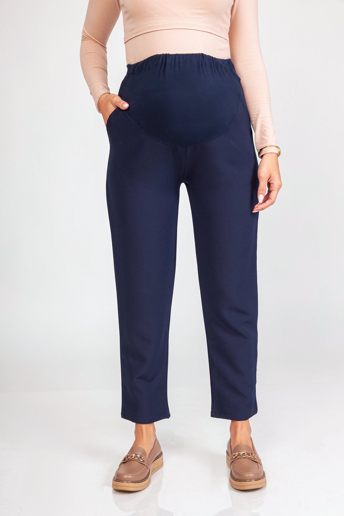 Pantalón con regulador en la cintura. Pantalón Básico de vestir con espalda alta lleva pinzas y vuelta para entallar el cuerpo, en la parte delantera cuenta con una barriguita de algodón que se va adaptando a tu embarazo, lleva bolsillos diagonales en la parte delantero.